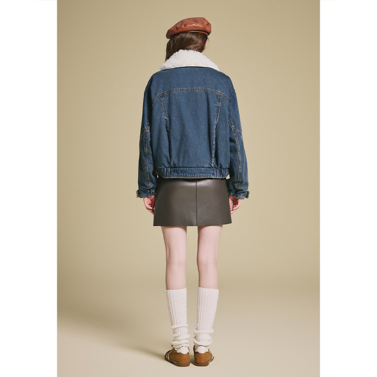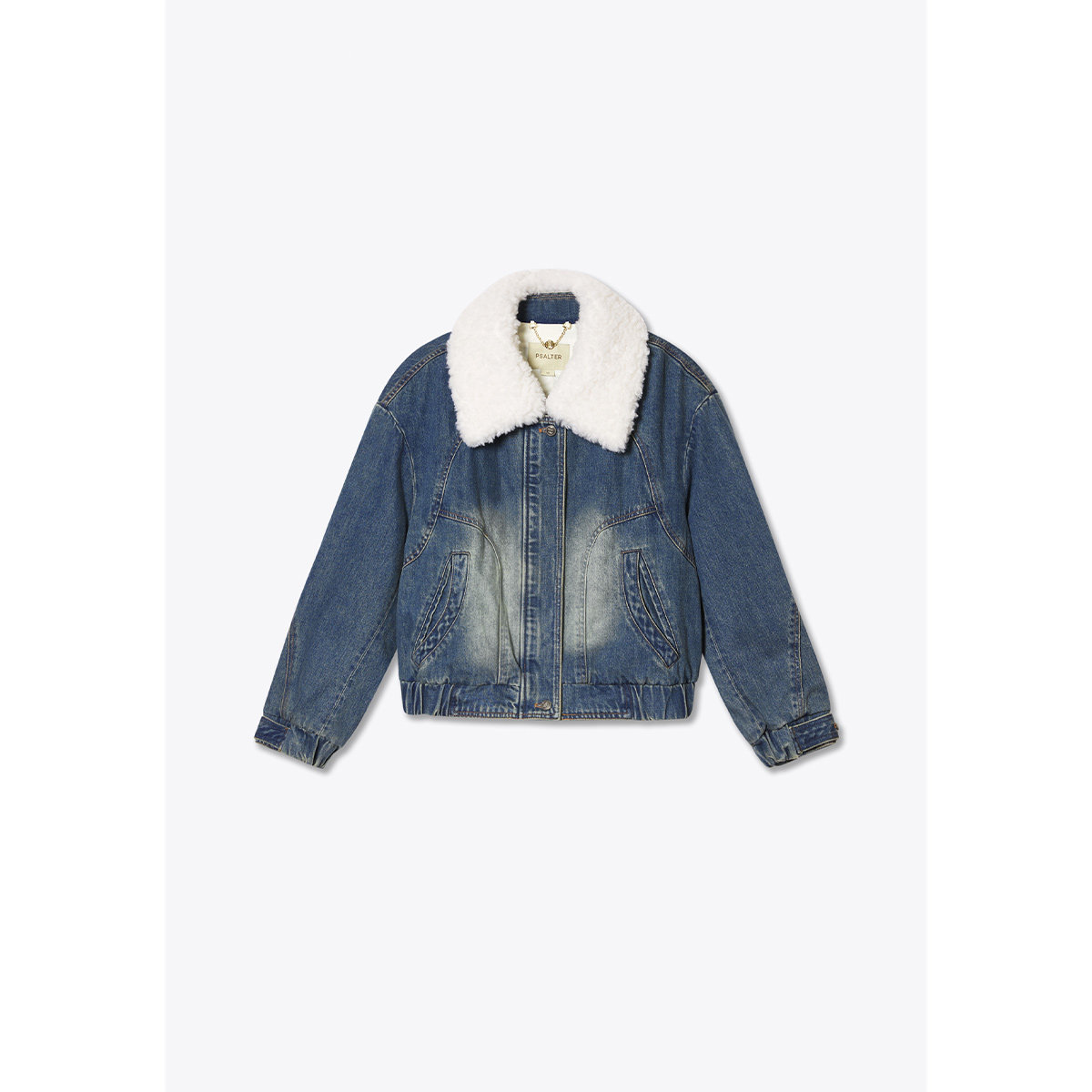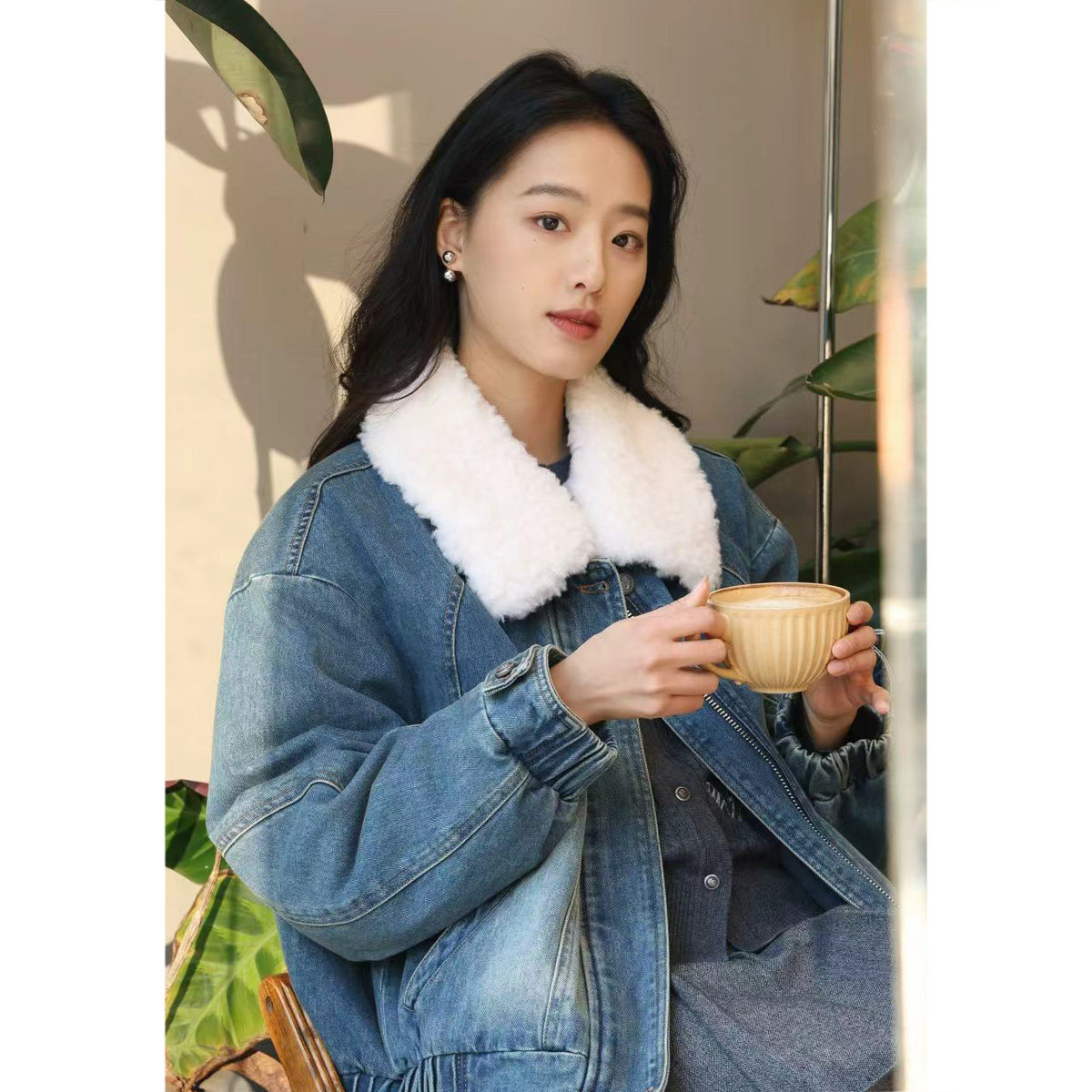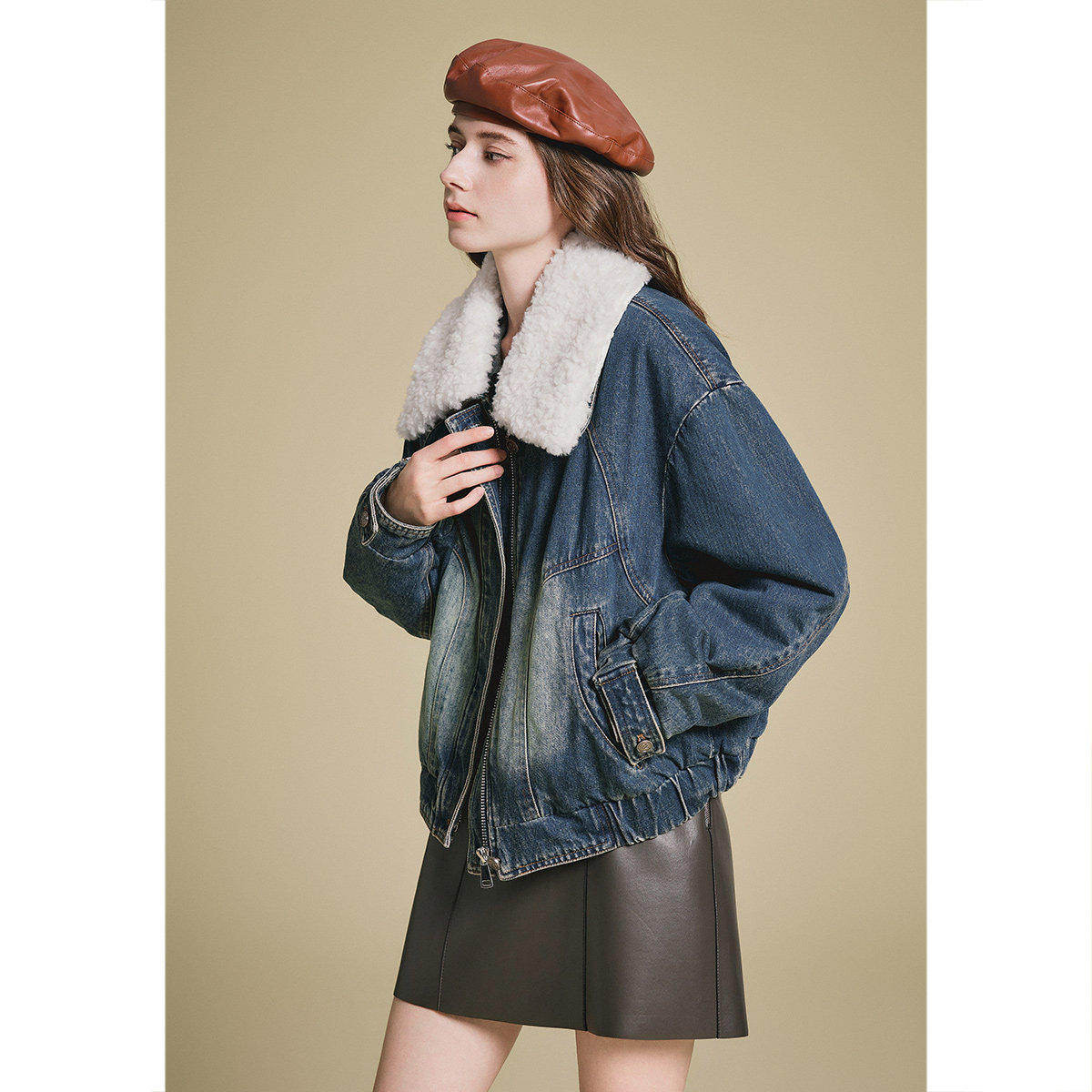 诗篇专选复古牛仔水洗拼接羊毛领鹅绒填充羽绒服女冬款