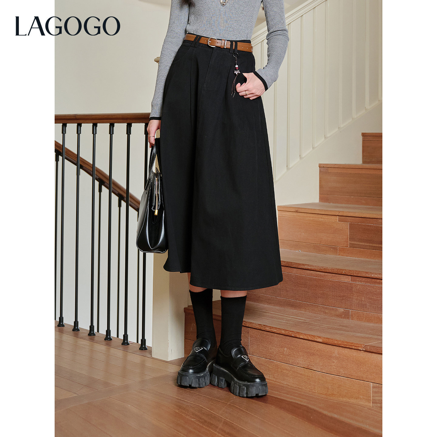 LAGOGO黑色气质伞裙半身裙女拉谷谷2025年冬新款纯棉休闲复古裙子