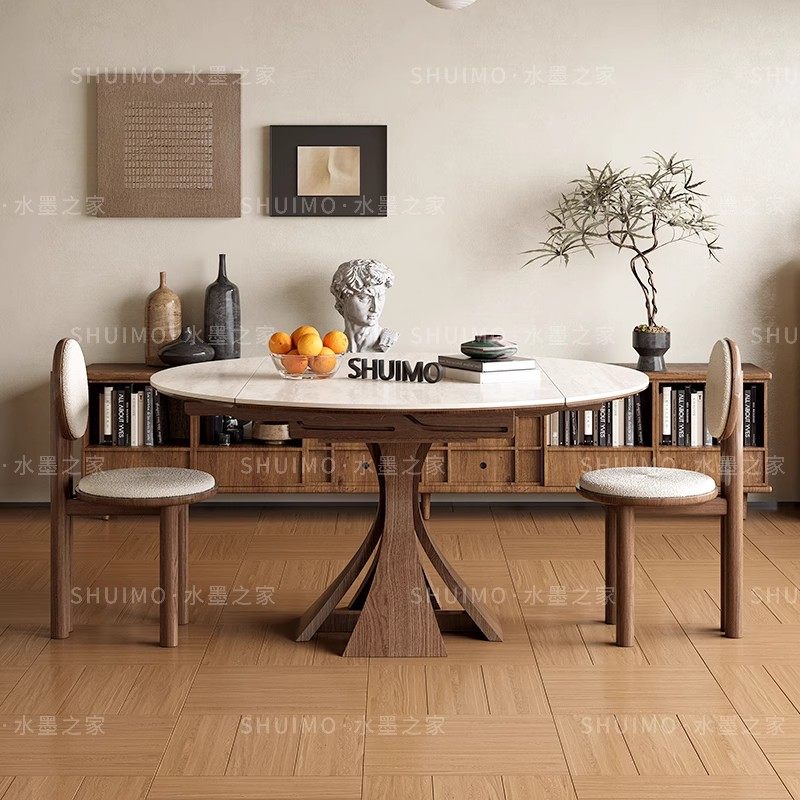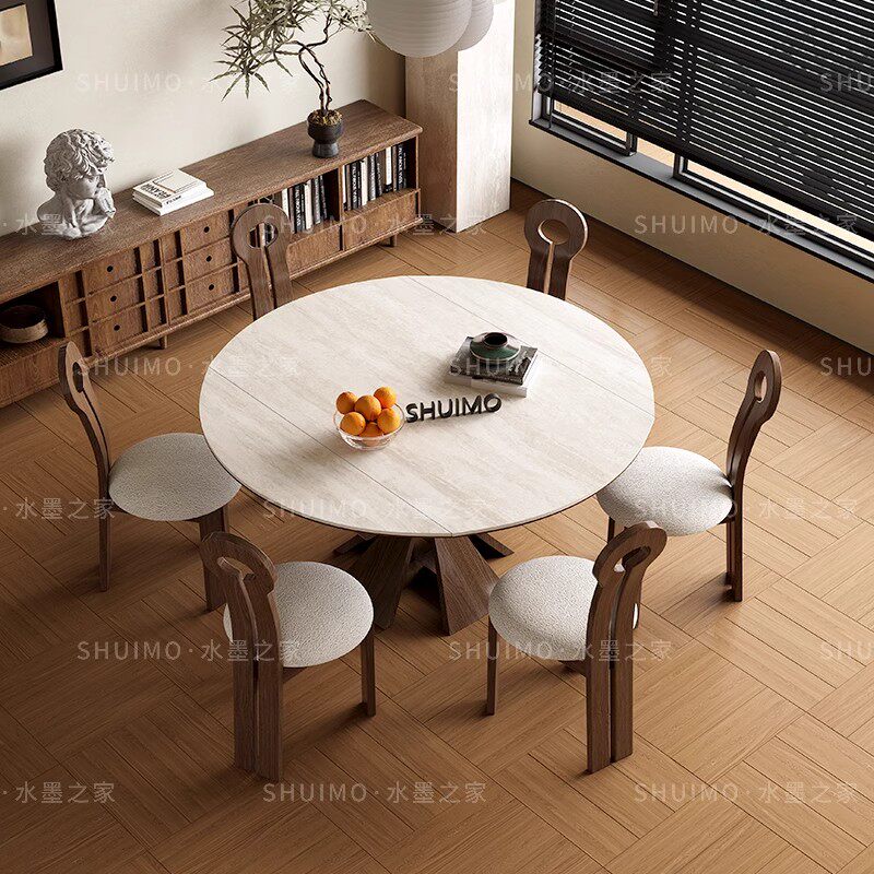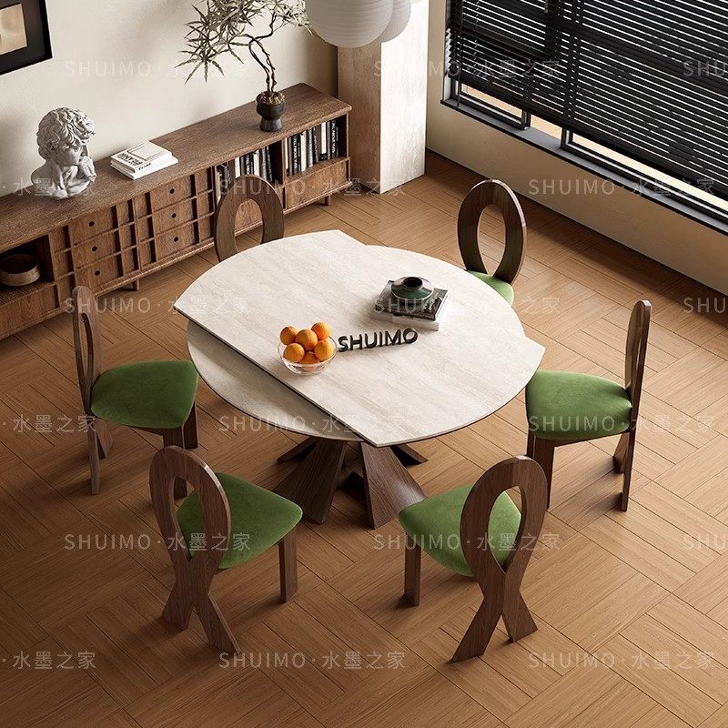 德利丰岩板洞石桌中古圆桌复古金属腿圆形餐桌法式包豪斯实木饭桌