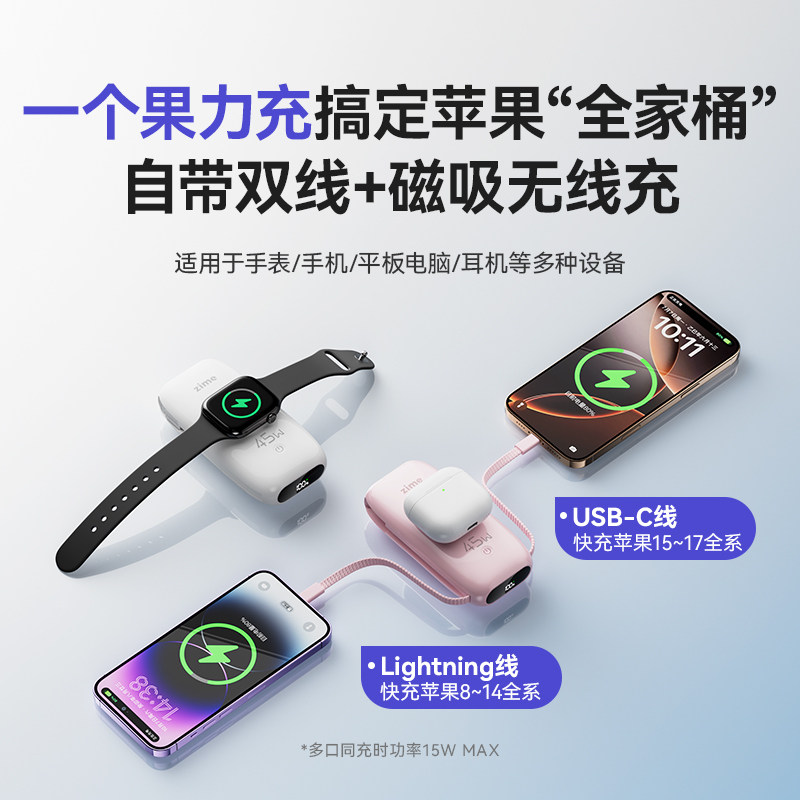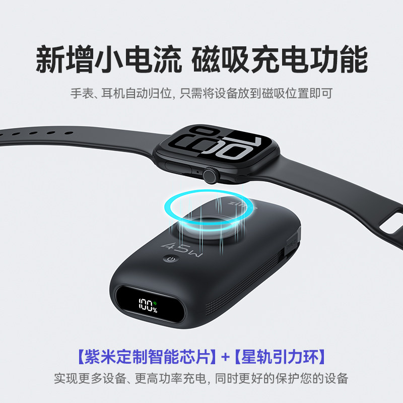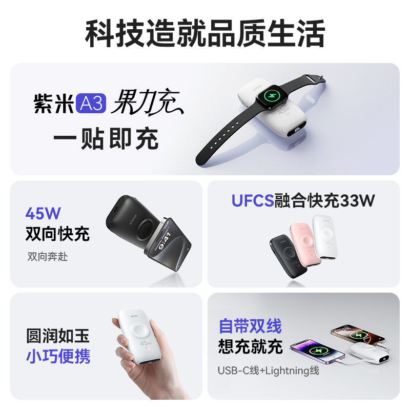 【国家3C认证】紫米A3果力充自带线充电宝10000毫安45W快充超薄小巧便携适用苹果手表专用磁吸无线充可上飞机