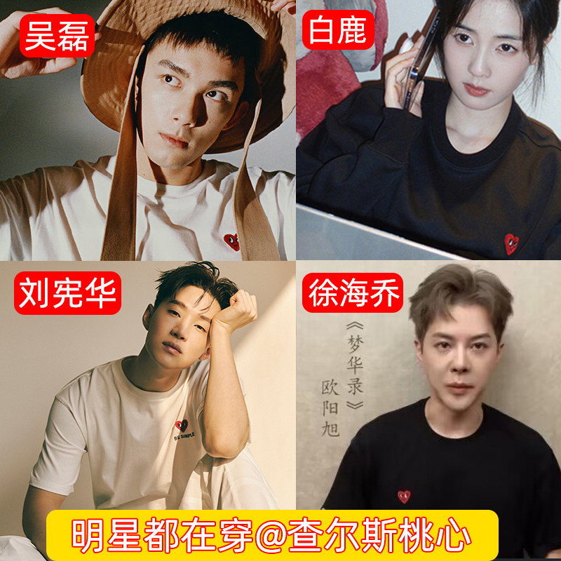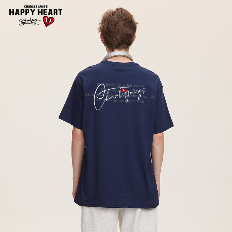 查尔斯桃心 美式纯棉短袖t恤男爱心刺绣花体签名字母宽松圆领半袖