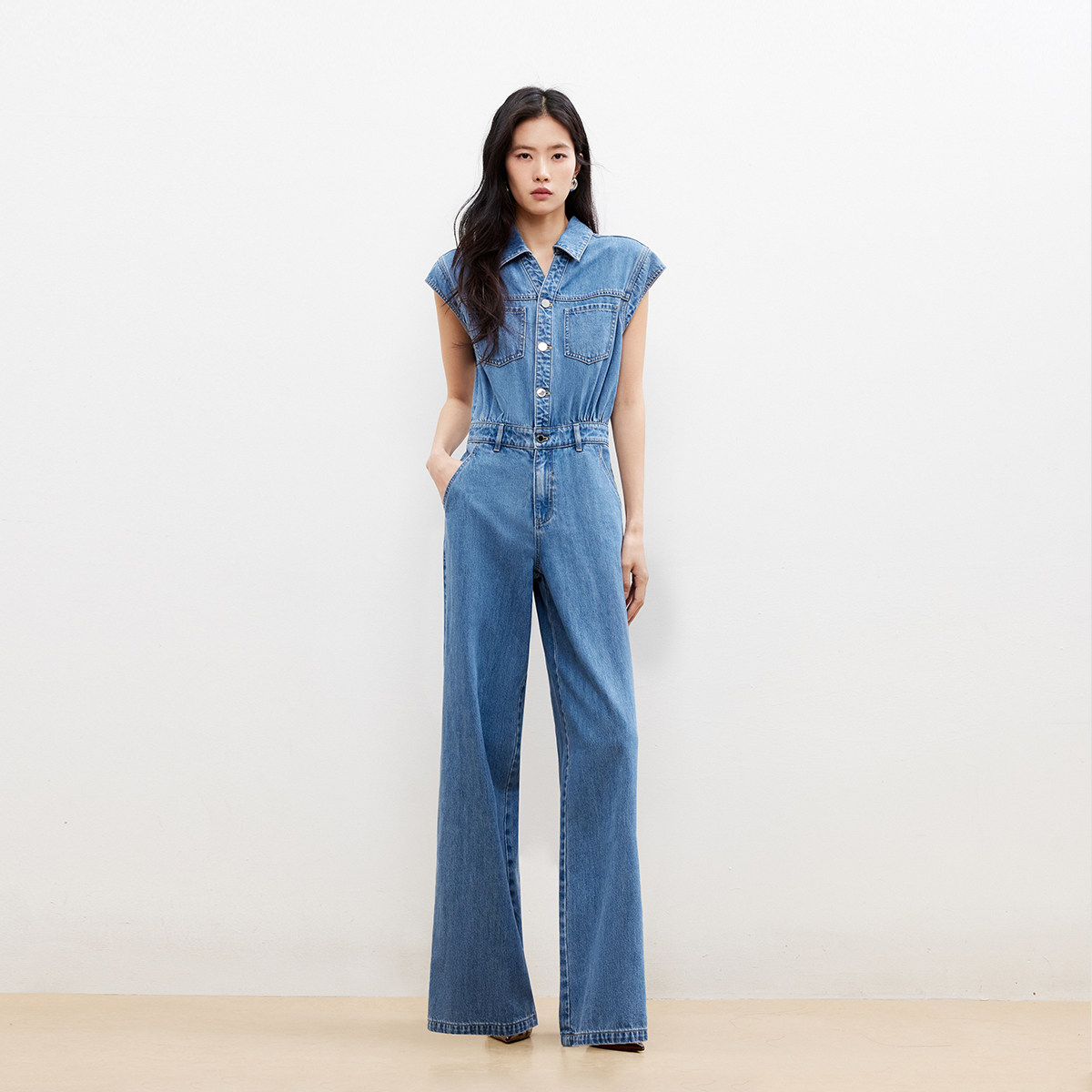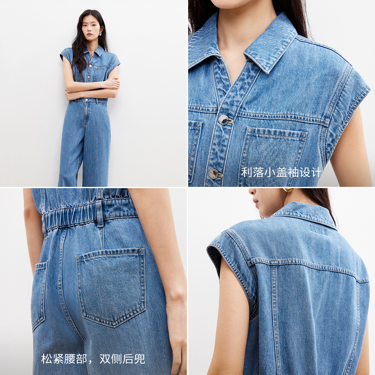 牛仔连体裤简约时尚,小盖袖修饰手臂线条