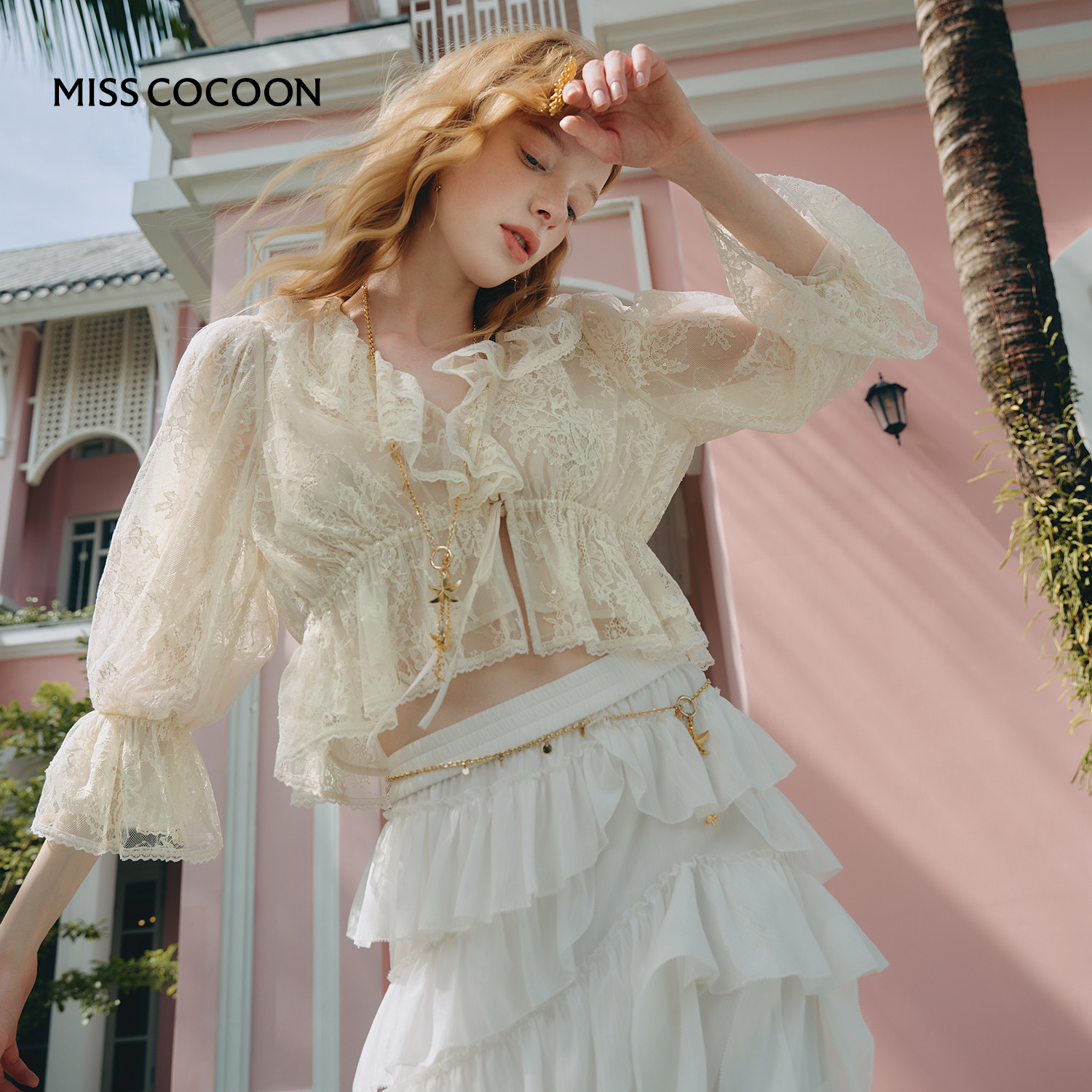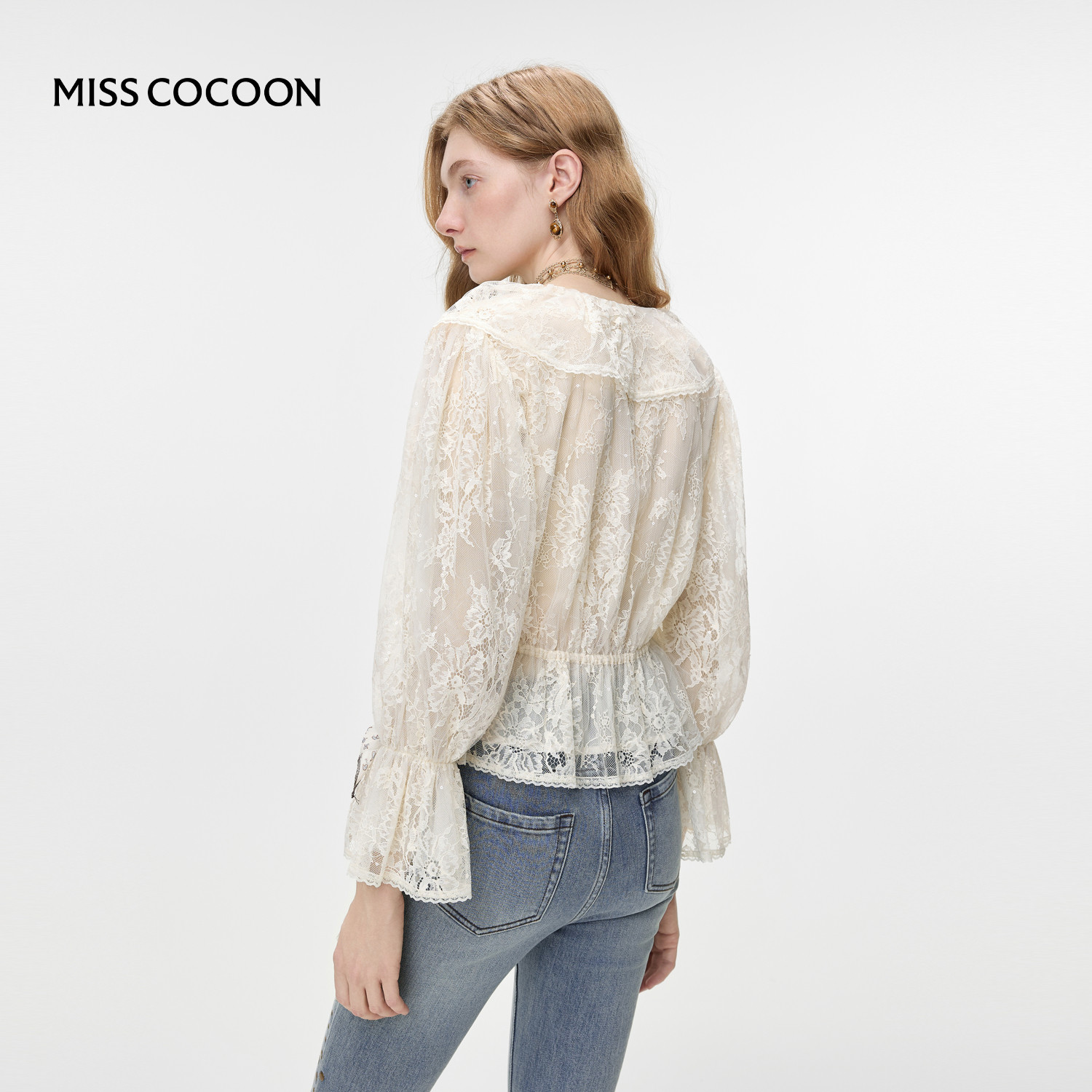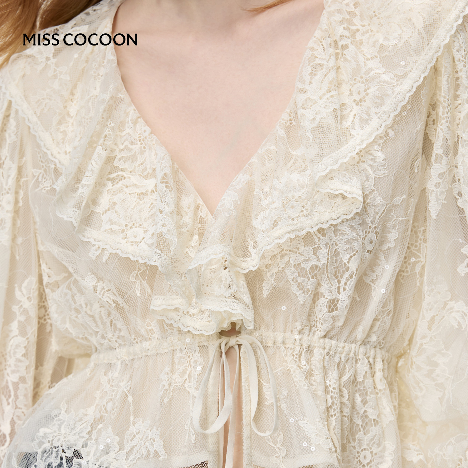 MISSCOCOON可可尼荷叶边法式上衣女2026春季新款白色V领蕾丝衬衫