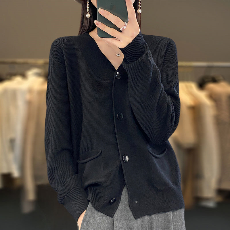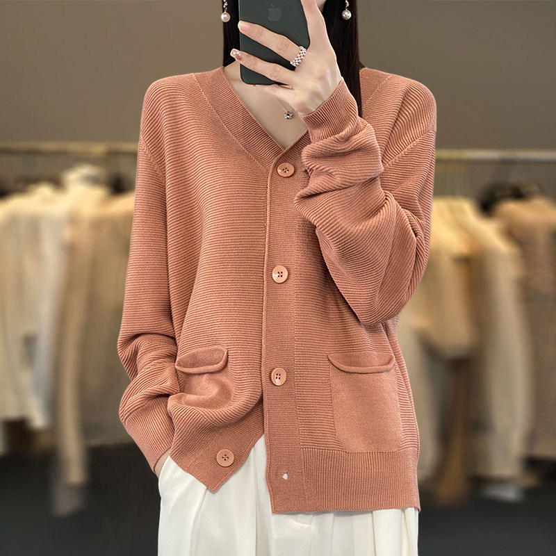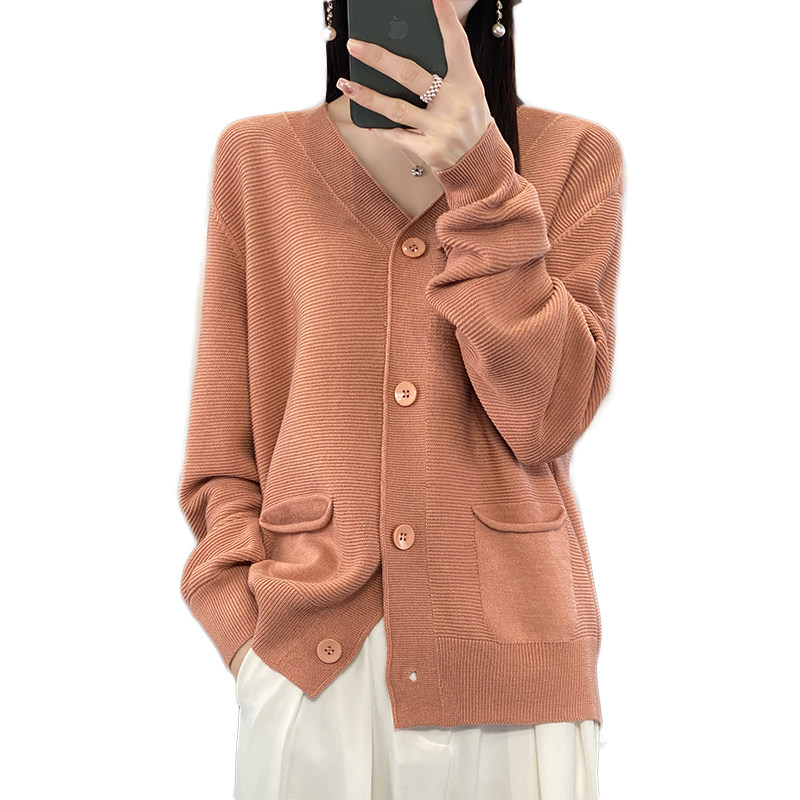 鄂尔多斯市断码羊绒开衫女春秋新款宽松毛衣外套翻领针织羊毛衫