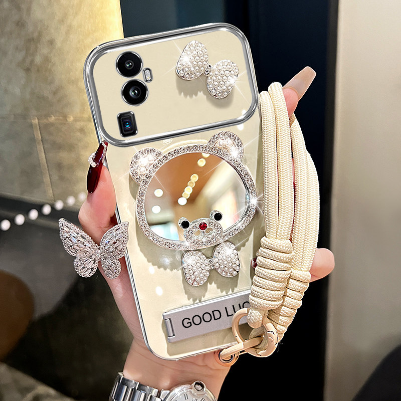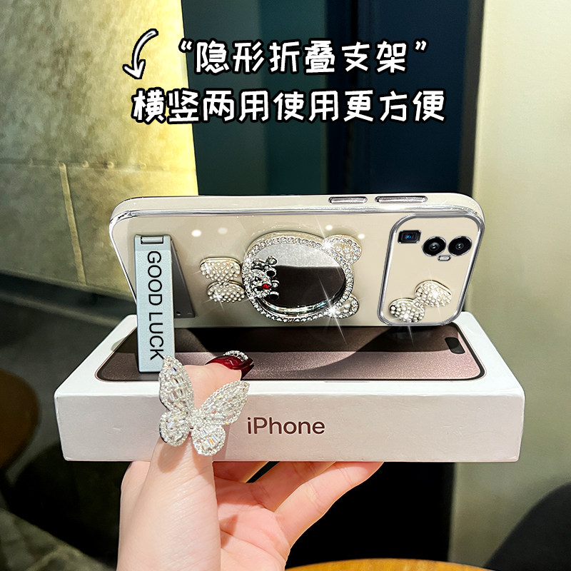 适用opporeno10手机壳reno10pro领结熊补妆镜大视窗创意全包电镀高级防摔支架壳