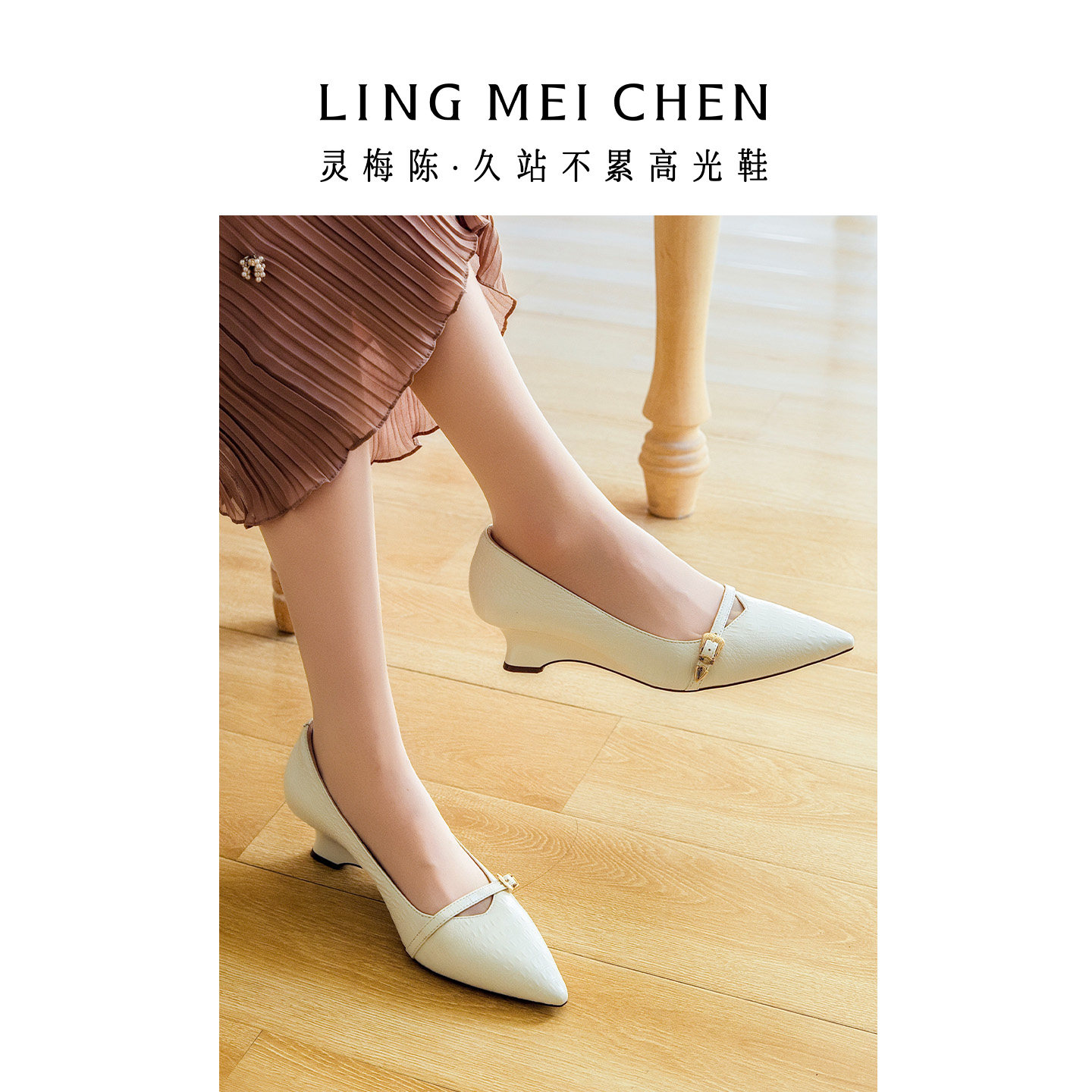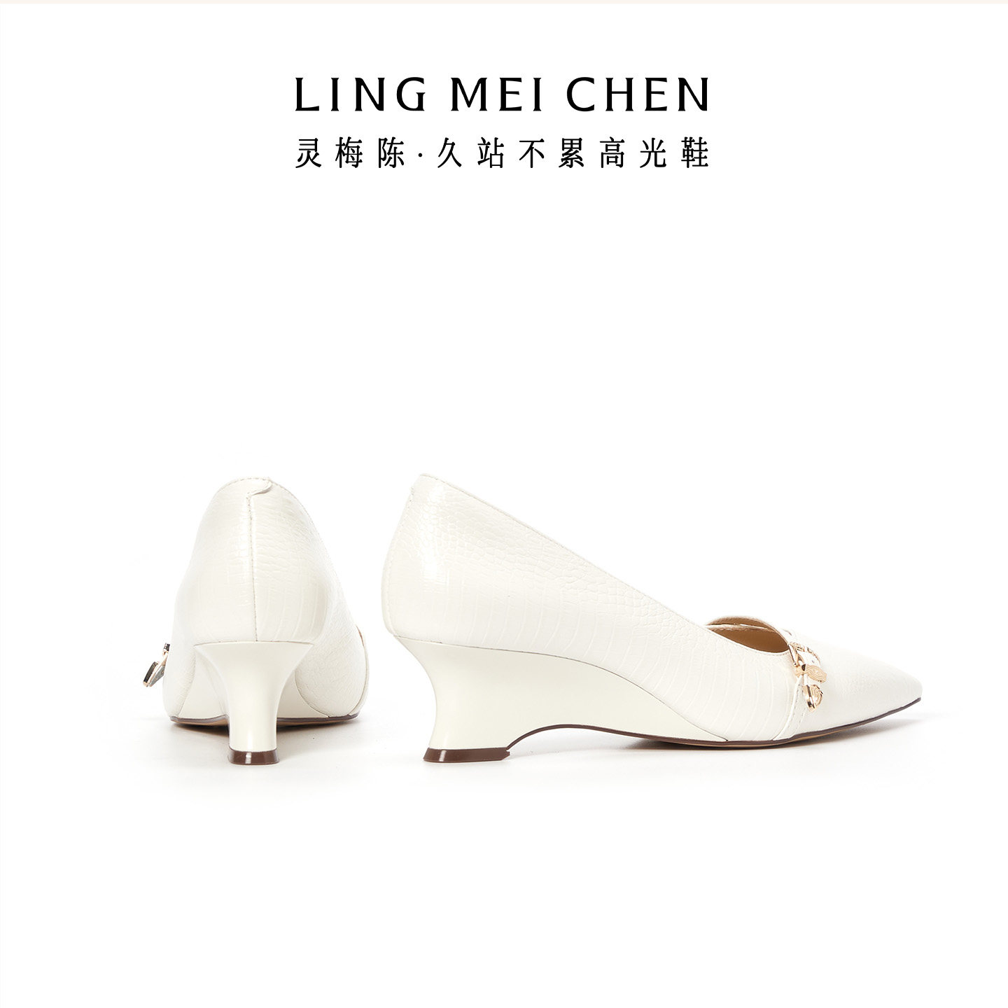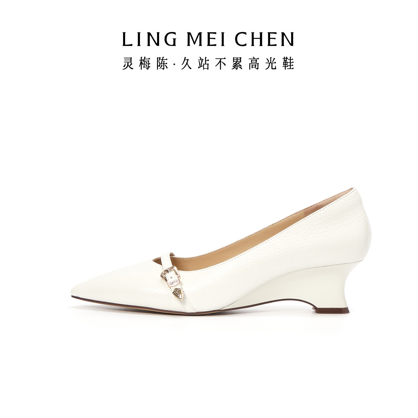 LINGMEICHEN坡跟高跟鞋尖头皮鞋女2026春新款配裙子白色粗跟单鞋