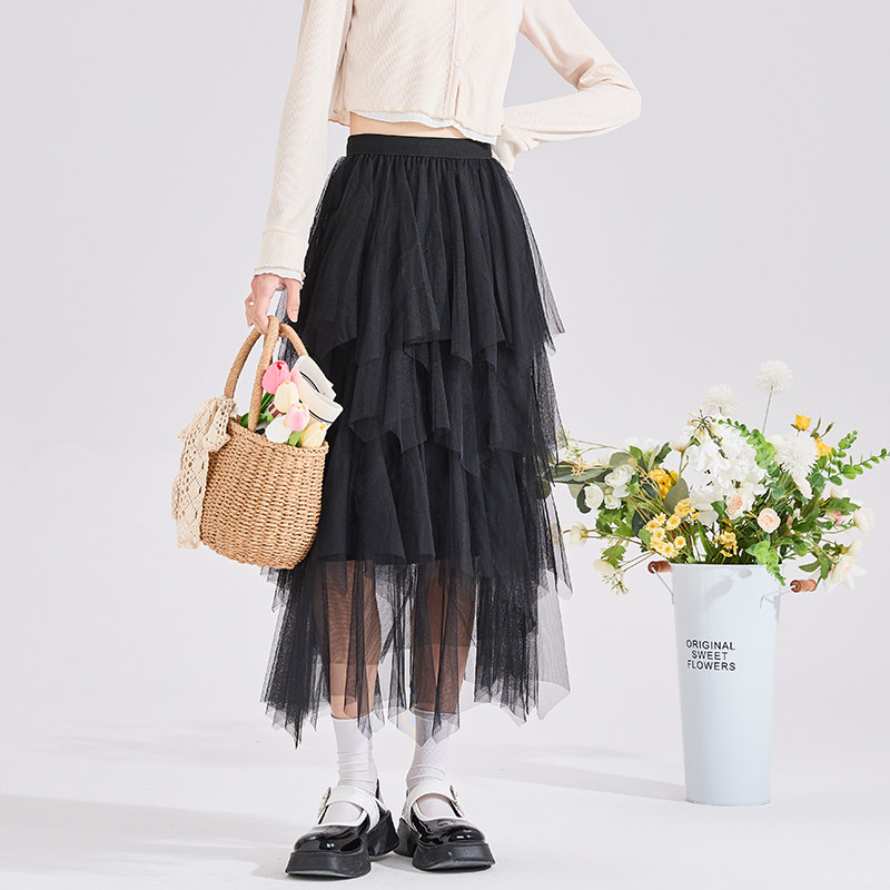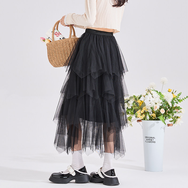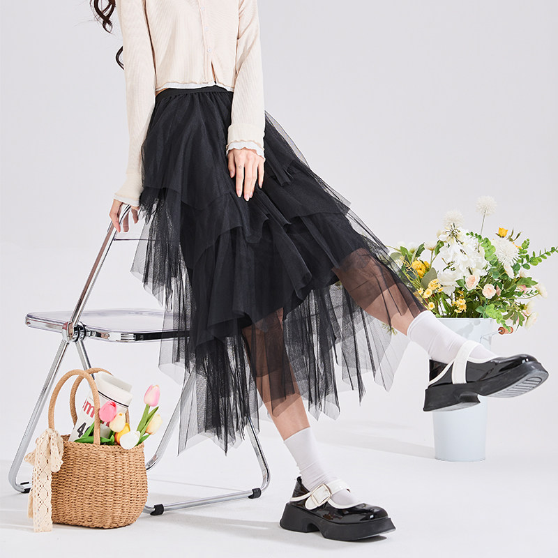 唐狮夏半身裙女中长款质感仙女纱裙不规则裙摆宽松甜美黑色蛋糕裙