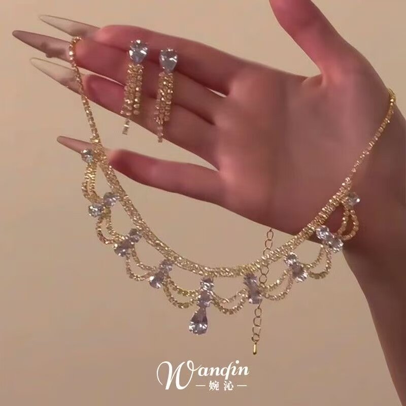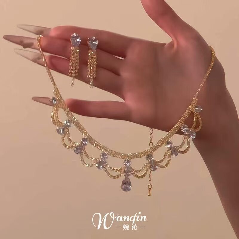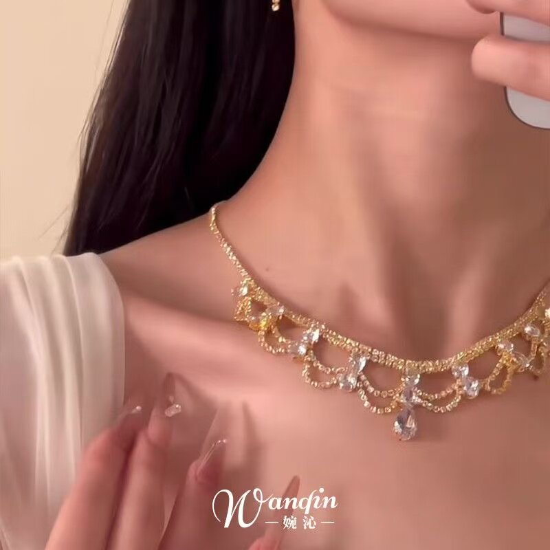 金包银水滴蕾丝套链项链女流苏镂空链条设计吊坠拉丝工锁骨