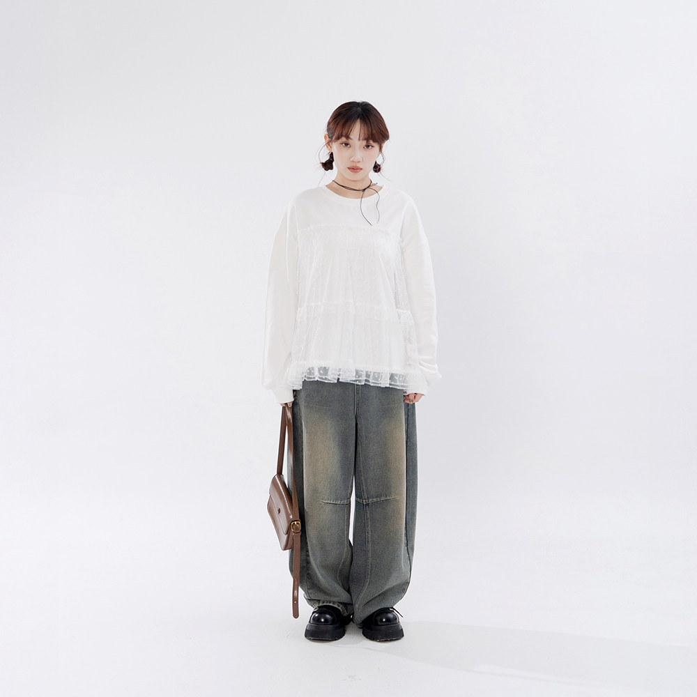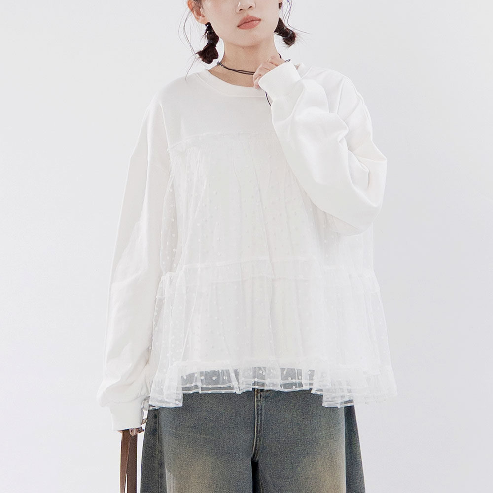 QUEENSHOP 2025秋冬新品女装荷叶小花透纱剪接设计卫衣01110990