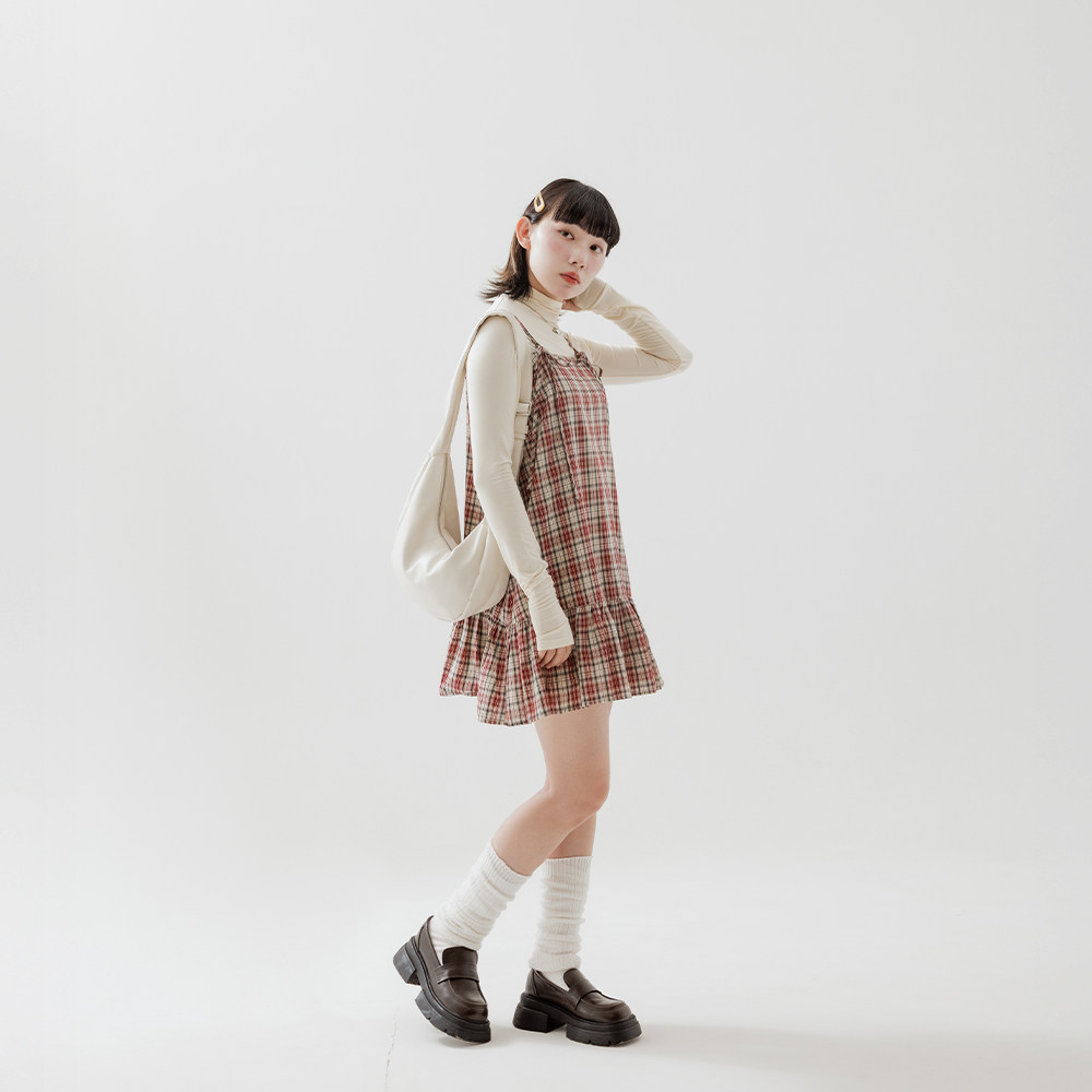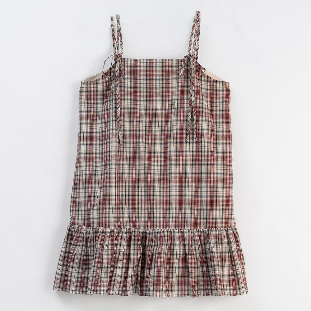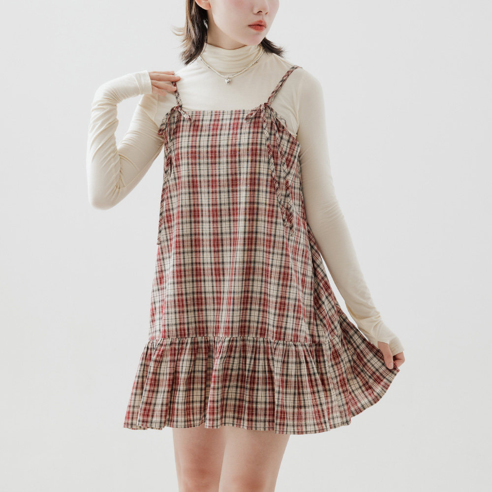 QUEENSHOP 2025秋冬新品女装质感格纹蝴蝶结绑连衣裙-红01087211