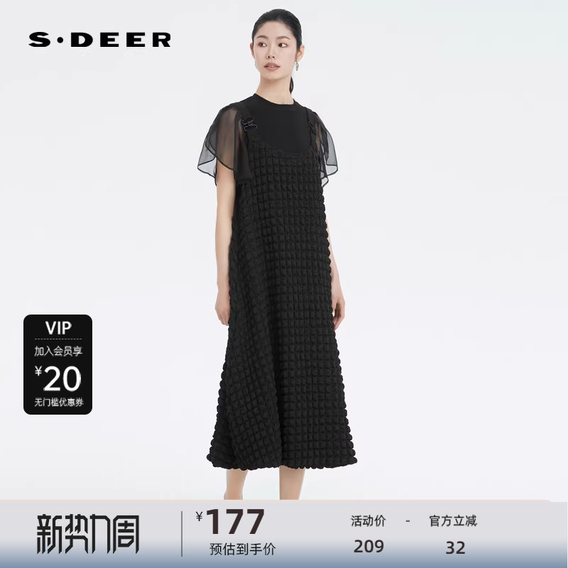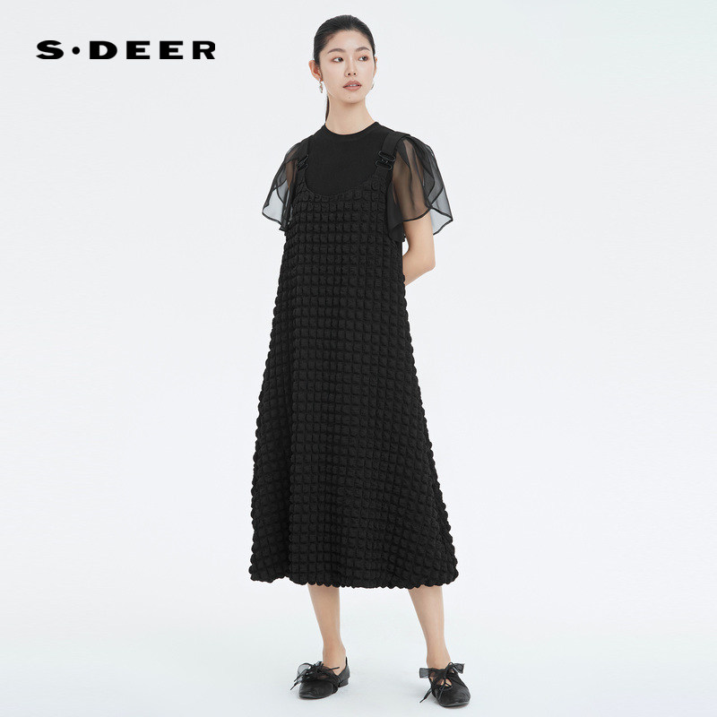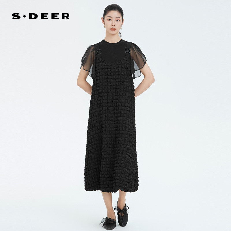 sdeer圣迪奥女装肌理褶皱不规则背带连衣裙S222Z12G7