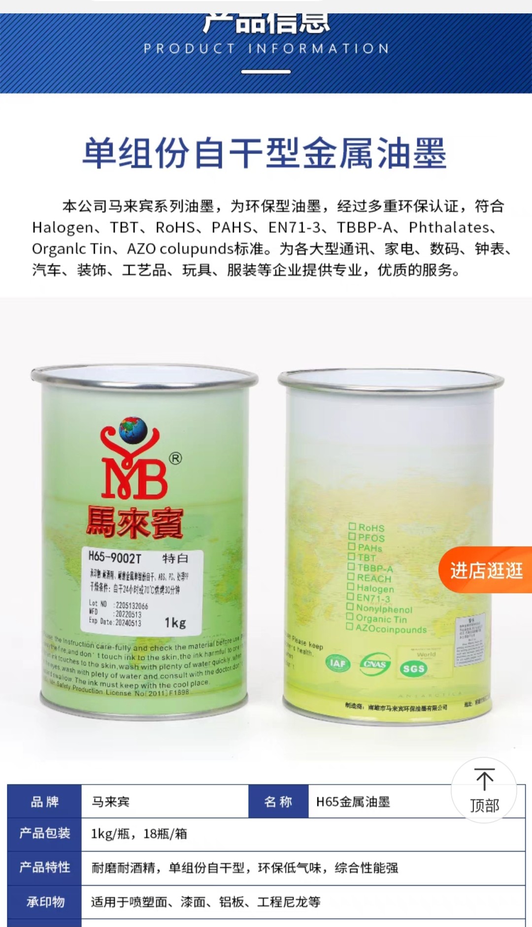马来宾H65金属喷塑油墨立固KG金属油墨ABS PC丝印自干单组份油墨