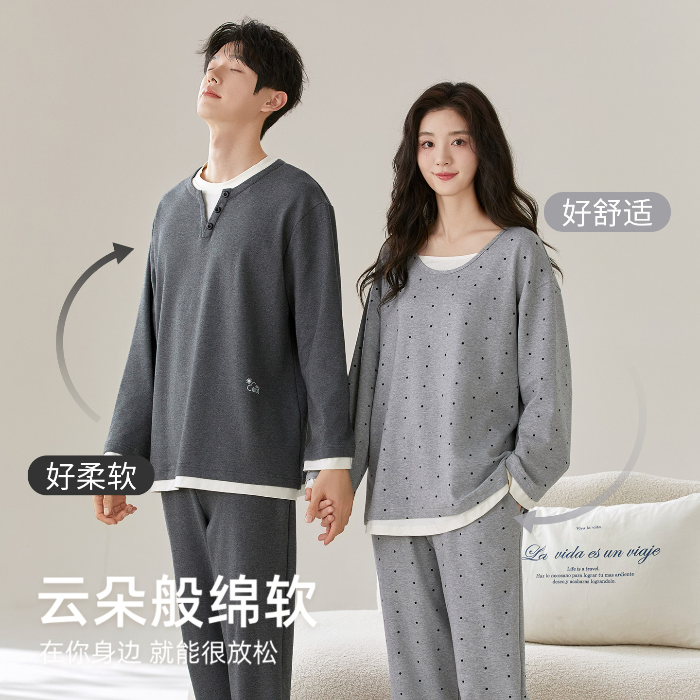 安比斯情侣睡衣舒适纯棉秋季女长袖男女同款休闲家居服套装可出门