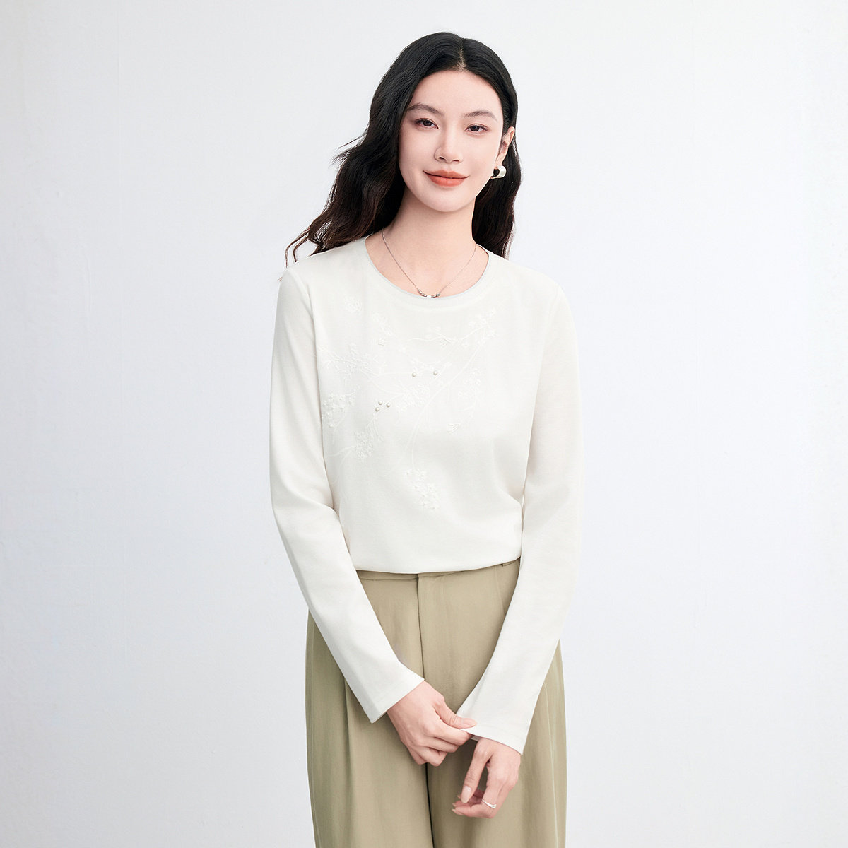 【莱赛尔纤维】菲妮迪雪纺衫2026春新款白色圆领修身长袖上衣女装