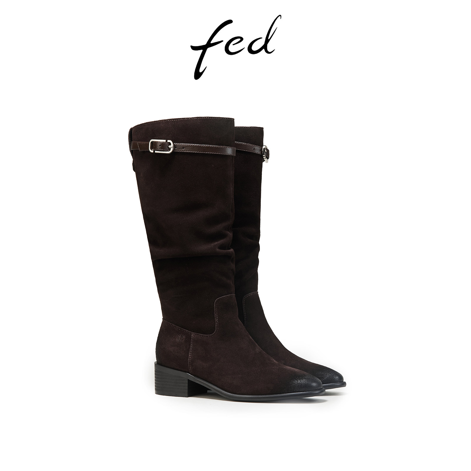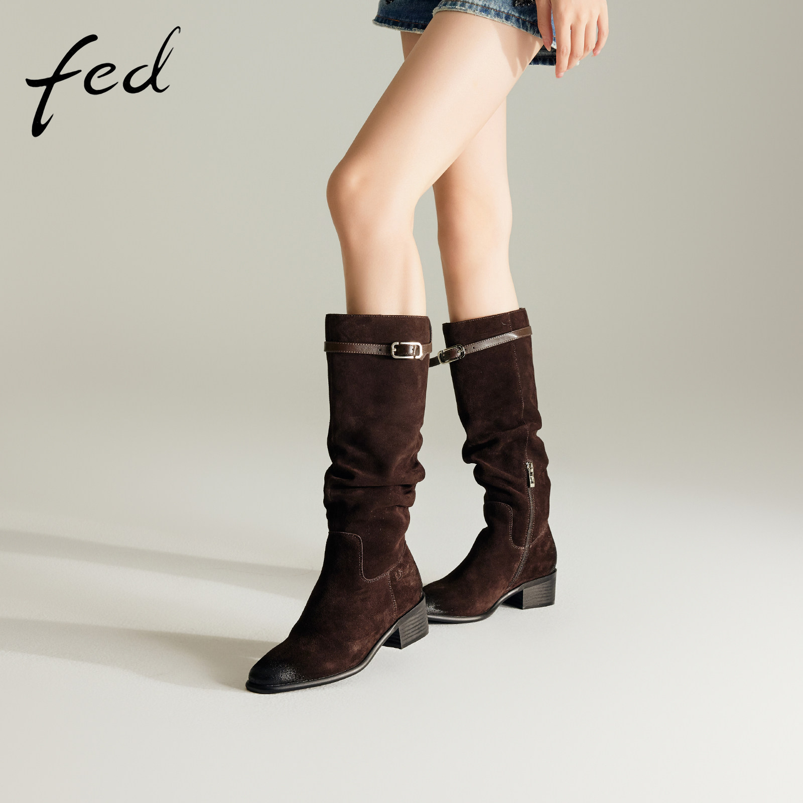 fed粗跟堆堆靴冬季新款女靴复古堆堆靴西部牛仔靴女D1004-ZCA920