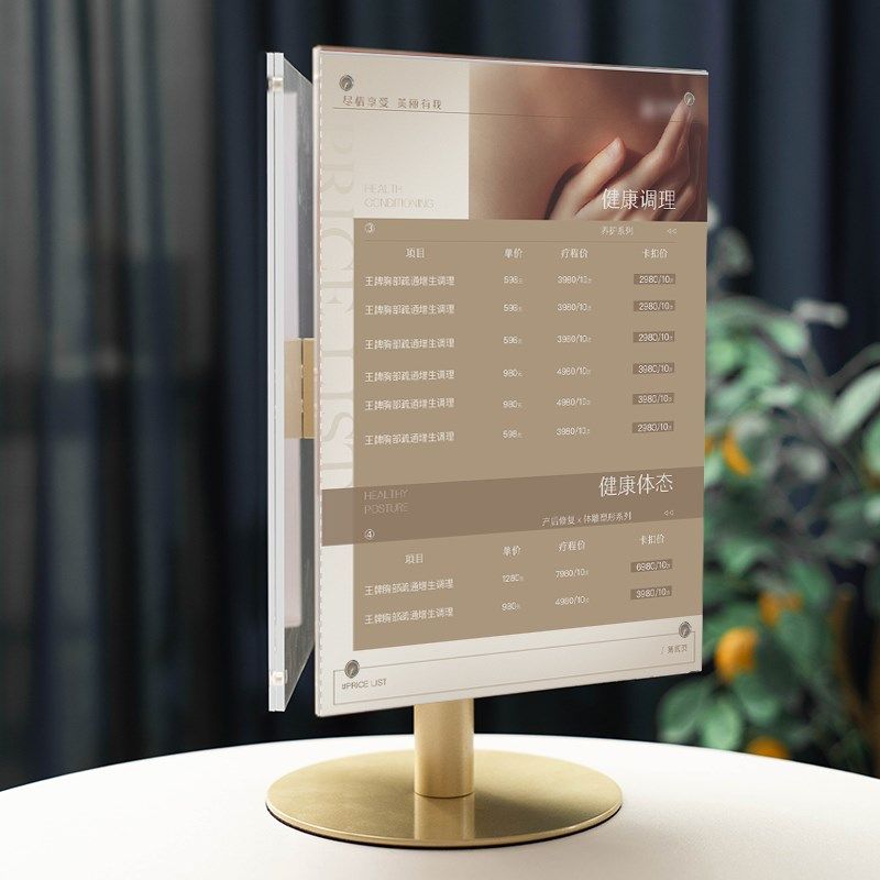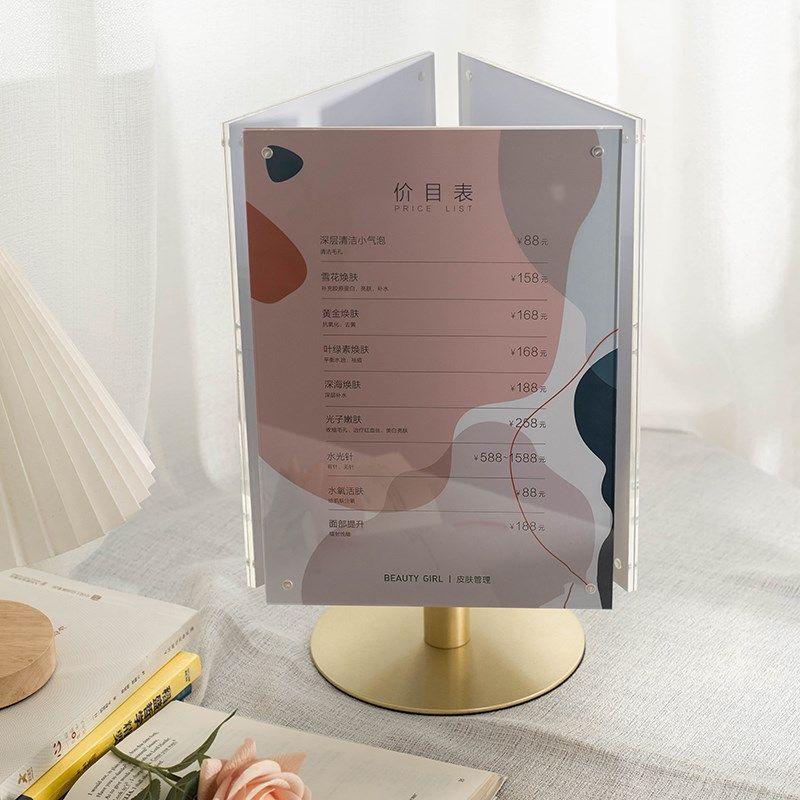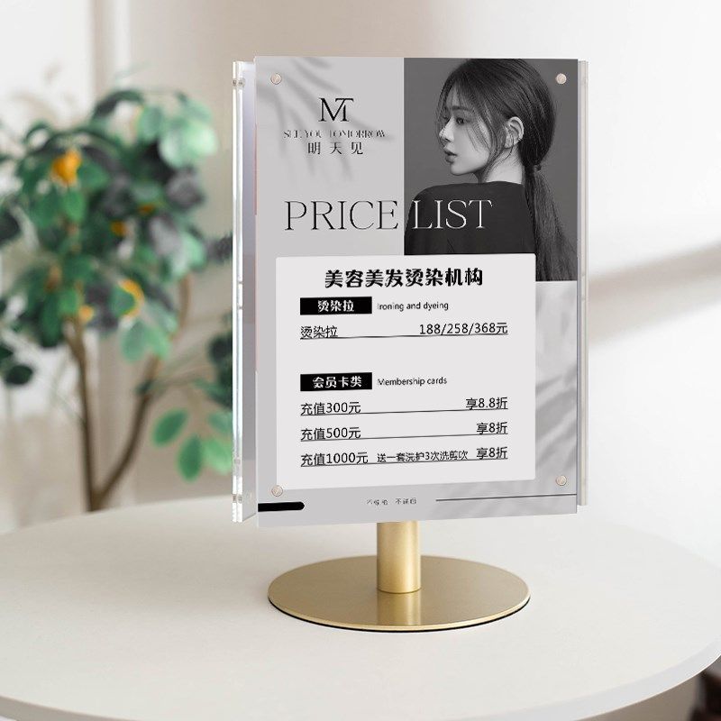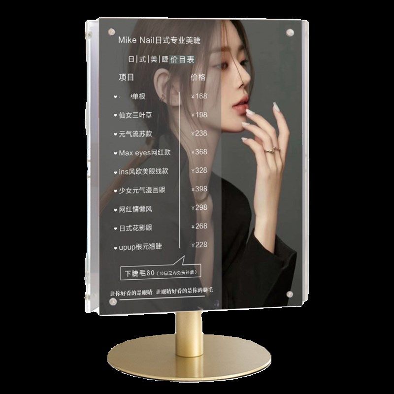 美容院价格表三面摆台卡美甲美睫美发高档金属旋转桌牌价目表定制