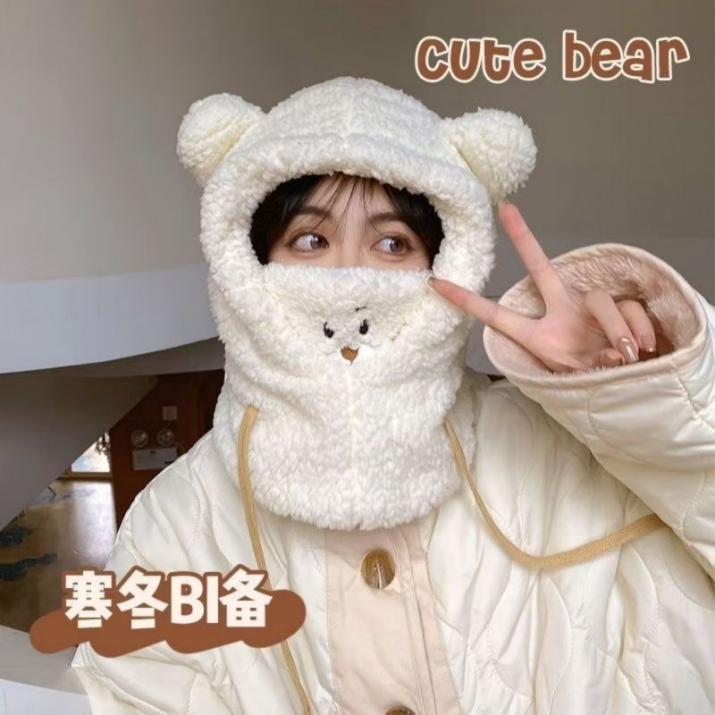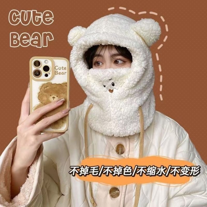 毛绒小熊围脖帽一体秋冬保暖帽子口罩遮脸围巾手套防风面罩过冬