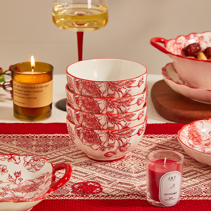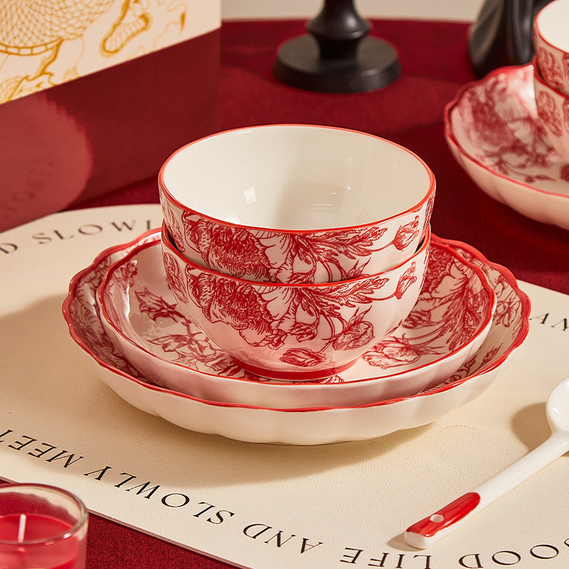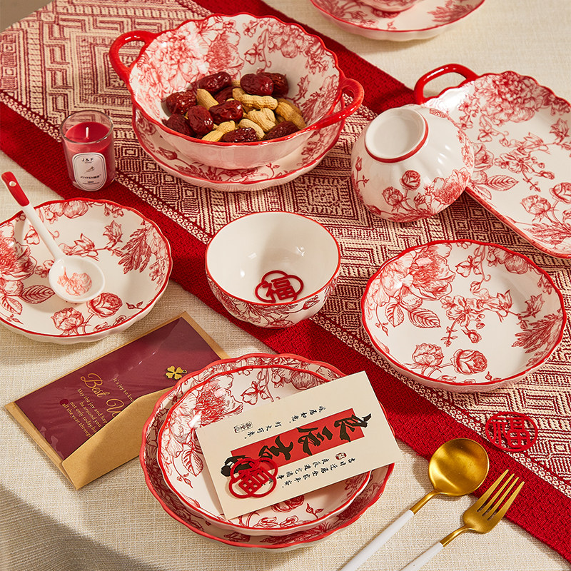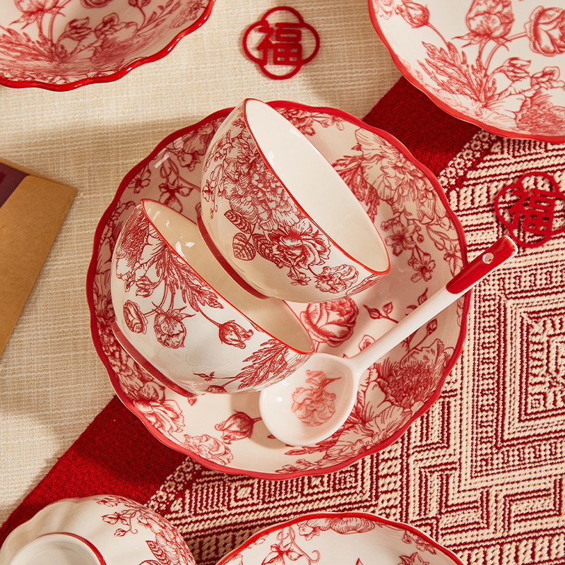 喜庆好看陶瓷饭碗家用2025新款玫瑰结婚新婚礼物餐具碗盘碟餐盘子