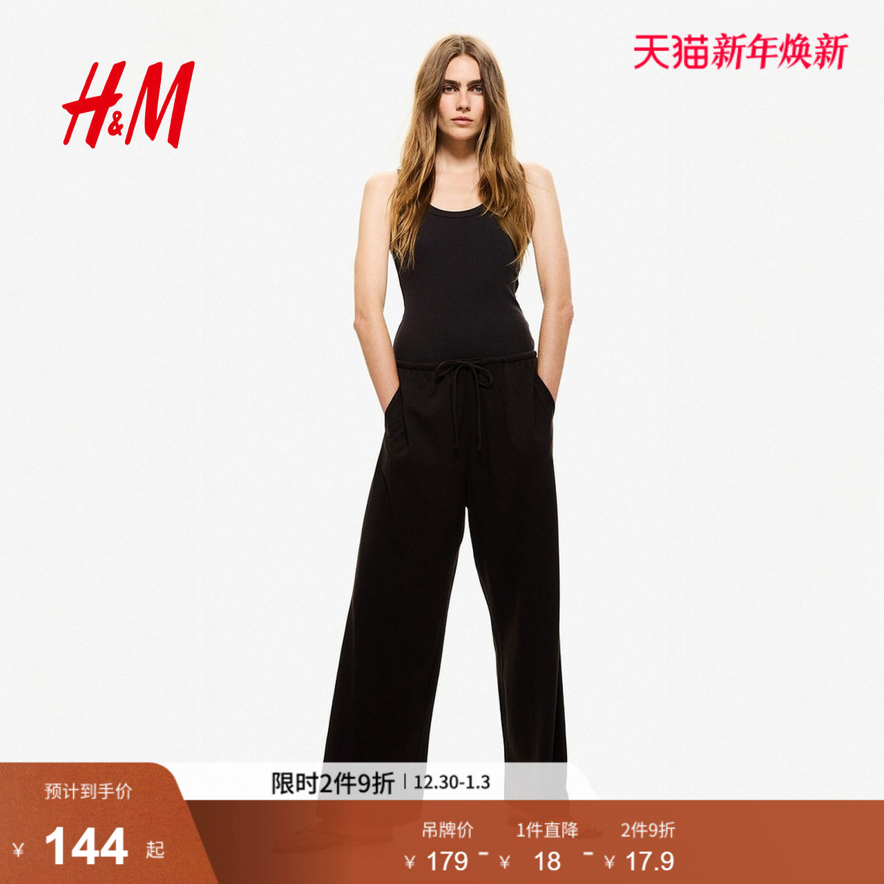 HM女装休闲裤冬季棉质直筒宽松休闲抽绳设计长裤1270859