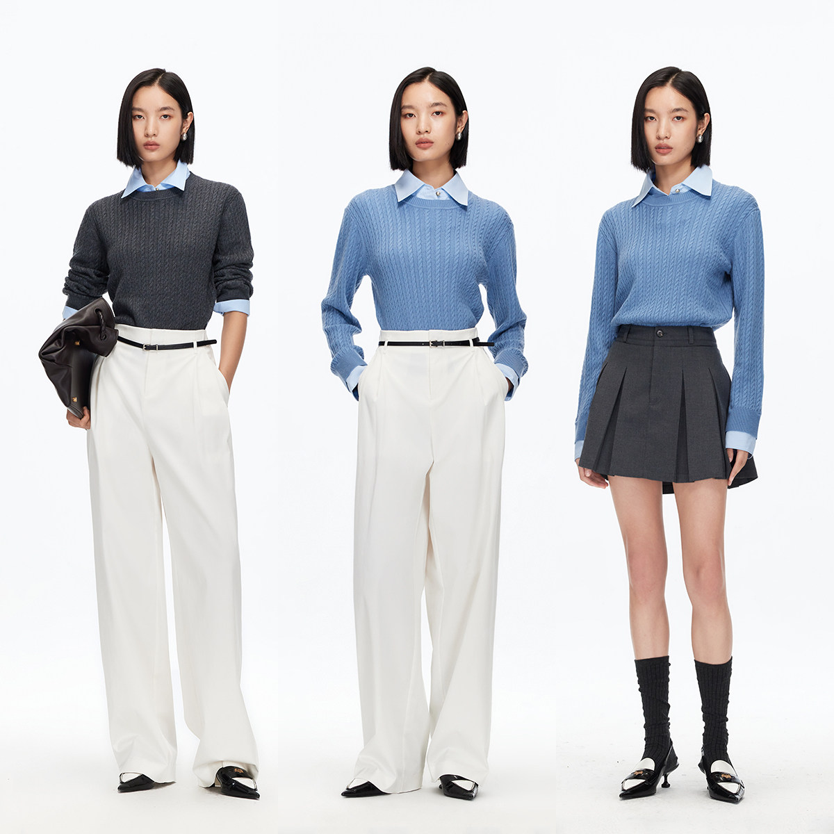 三福长袖上衣2025新款秋季圆领修身针织衫简约纯色内搭打底衫女装