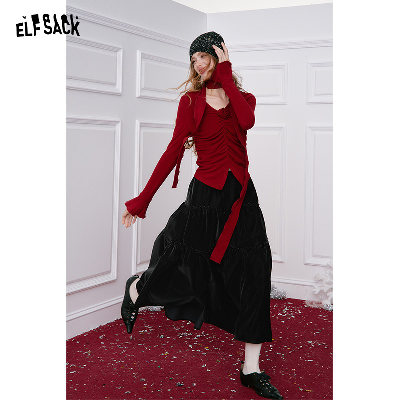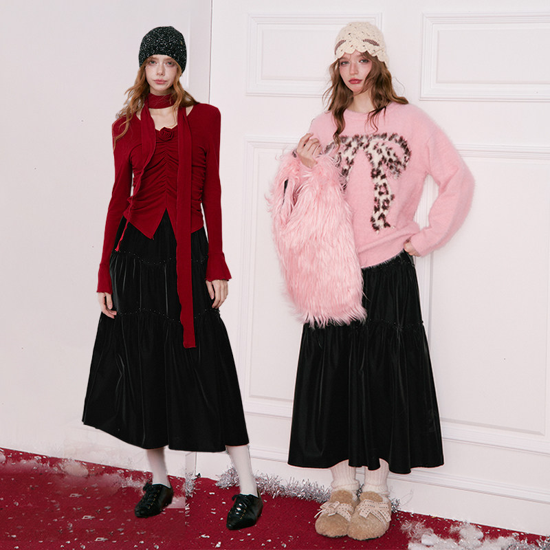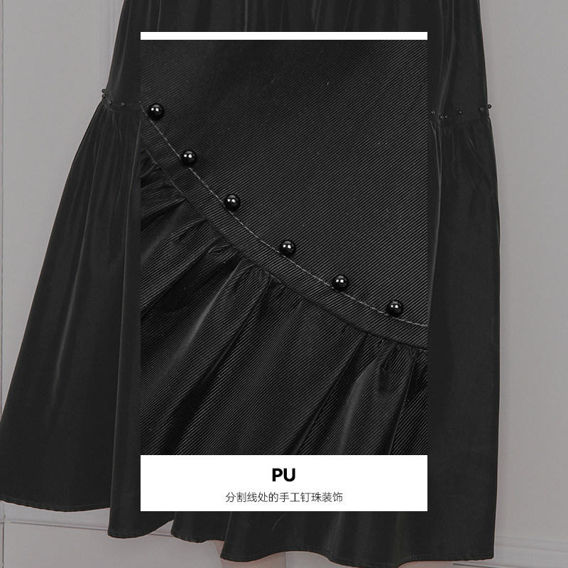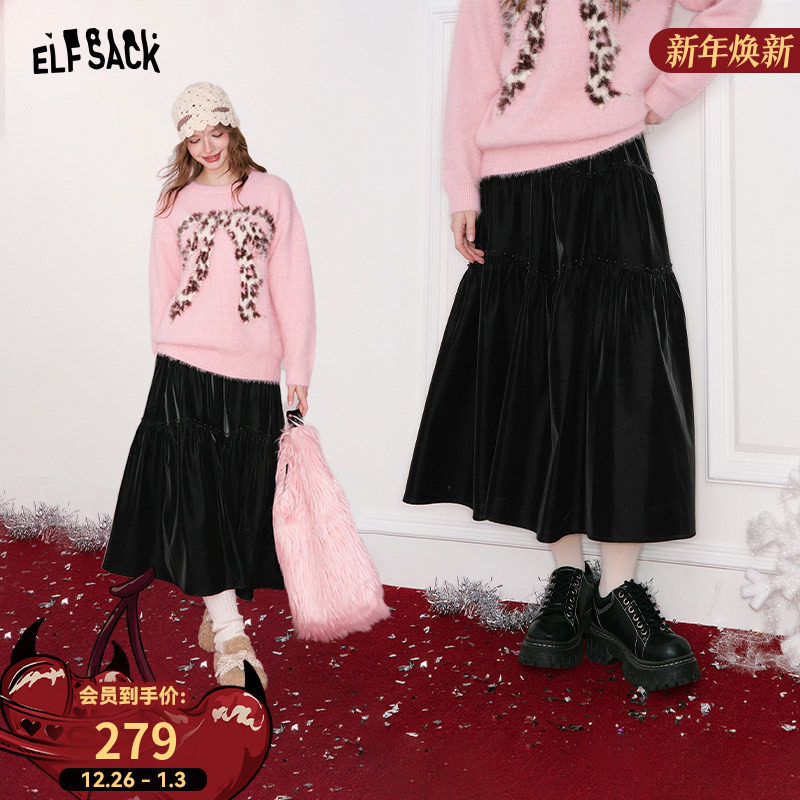 妖精的口袋重工钉珠哑光黑色半身裙女2025年冬季新款新年穿搭长裙
