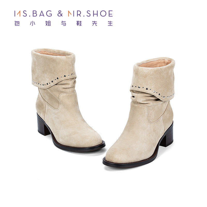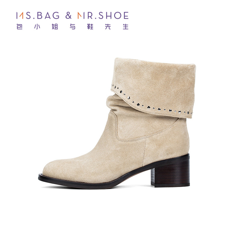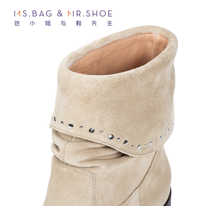 包小姐与鞋先生2025冬季新款通勤沙棕色铆钉工艺低跟堆堆靴254182