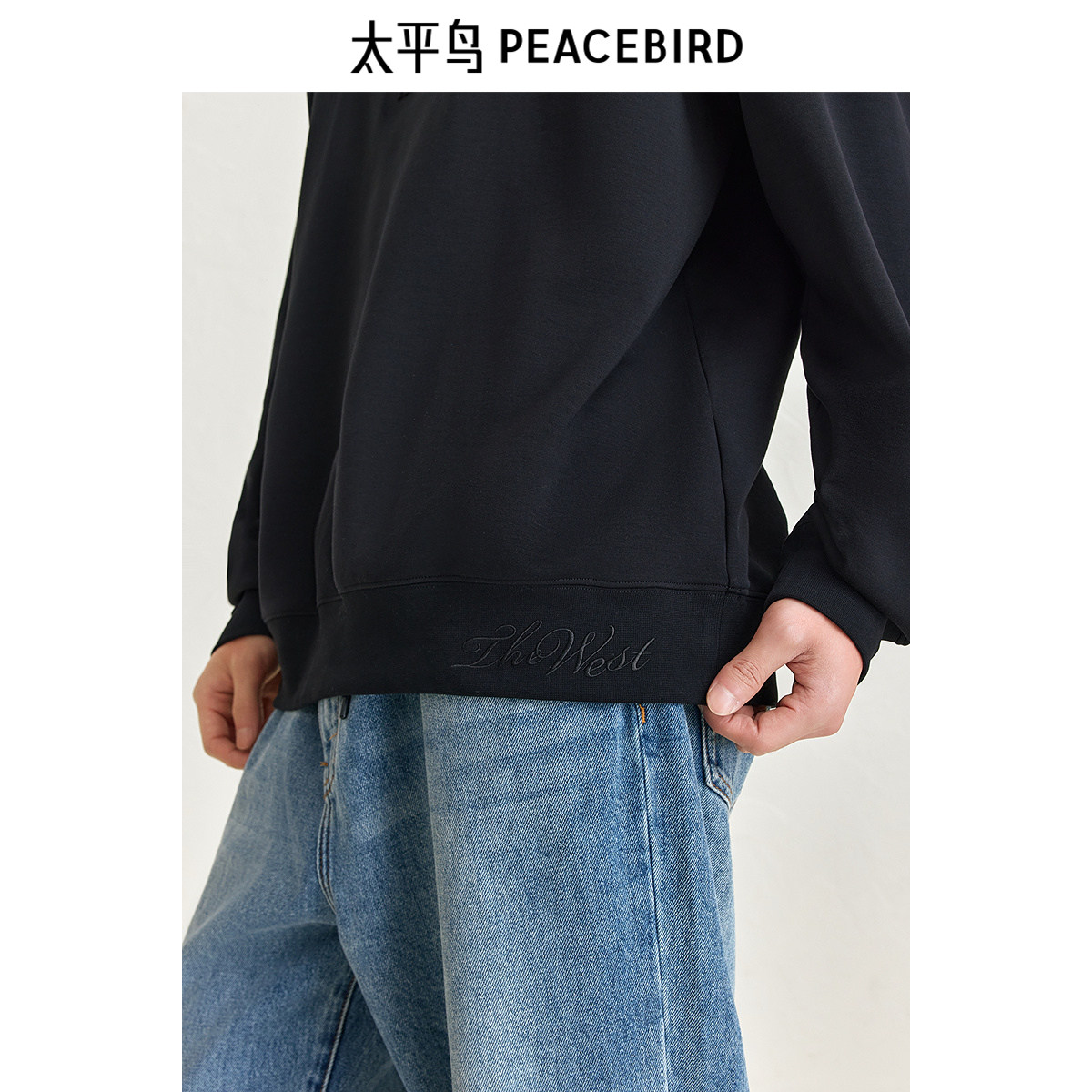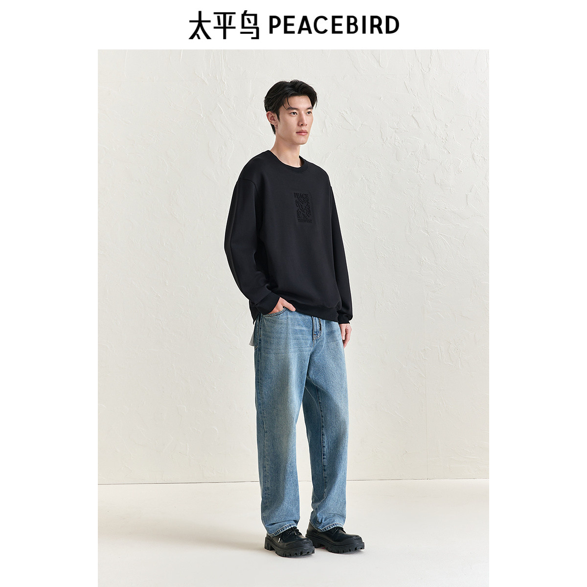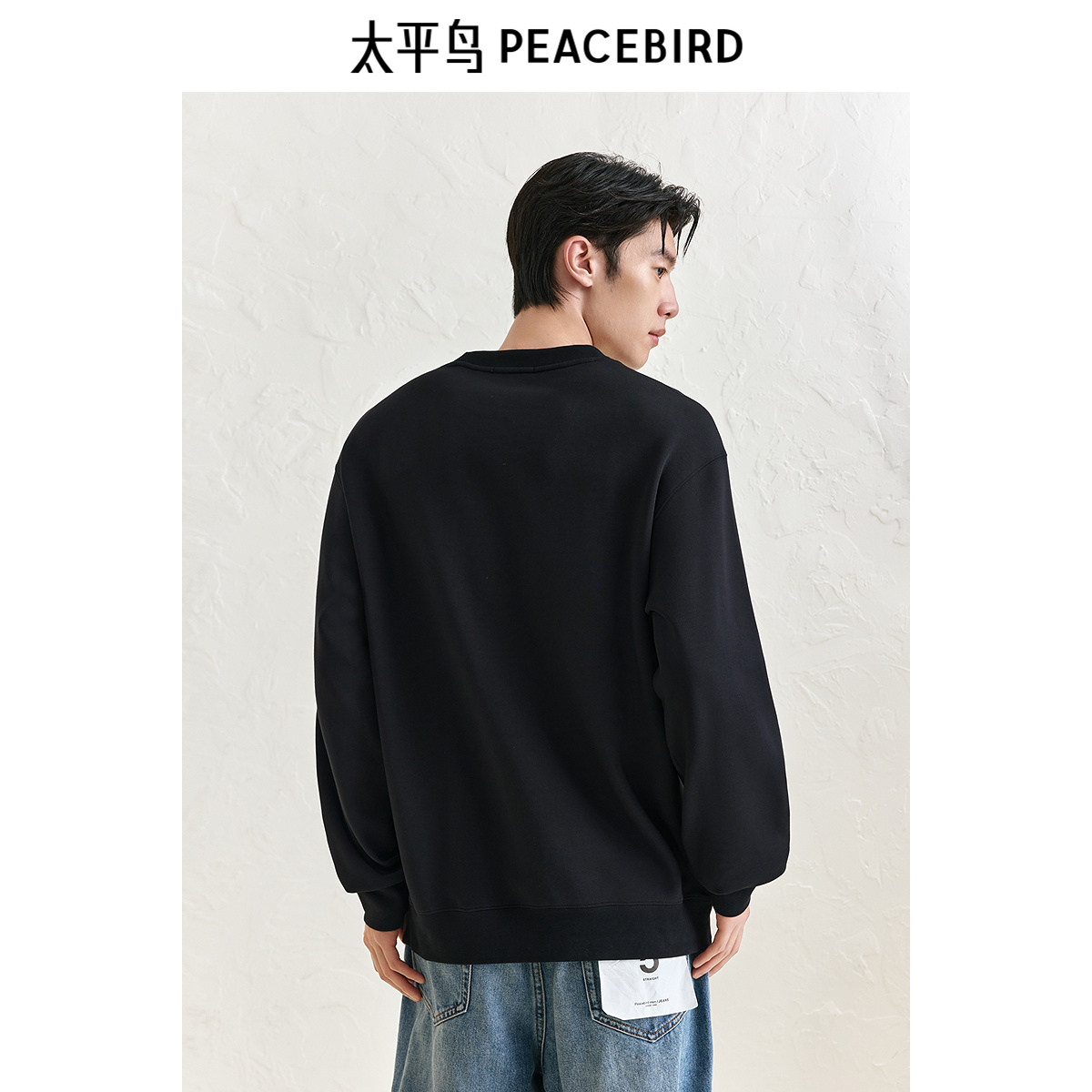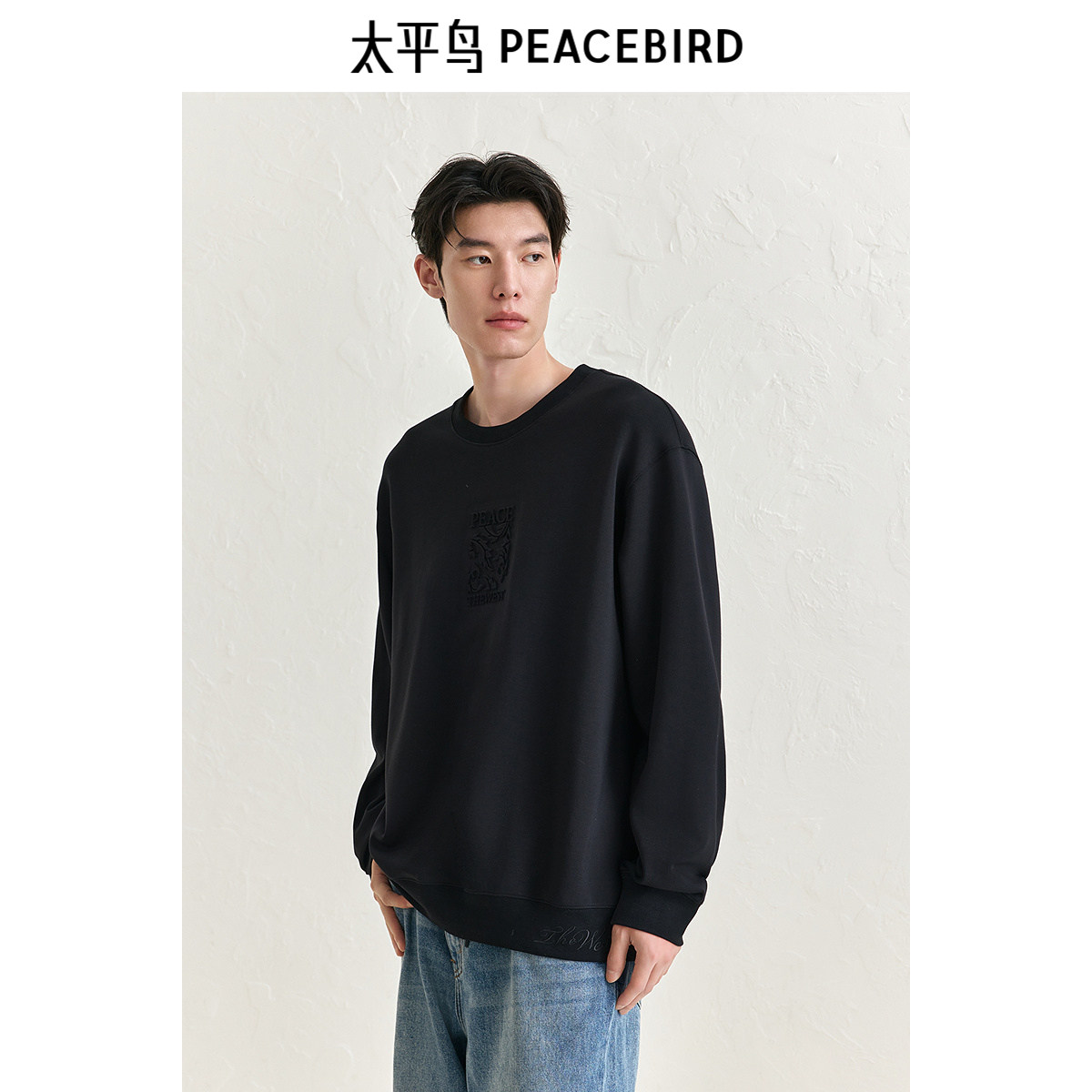 太平鸟男装 圆领莫代尔刺绣图案印花卫衣秋冬时尚黑色潮流上衣男