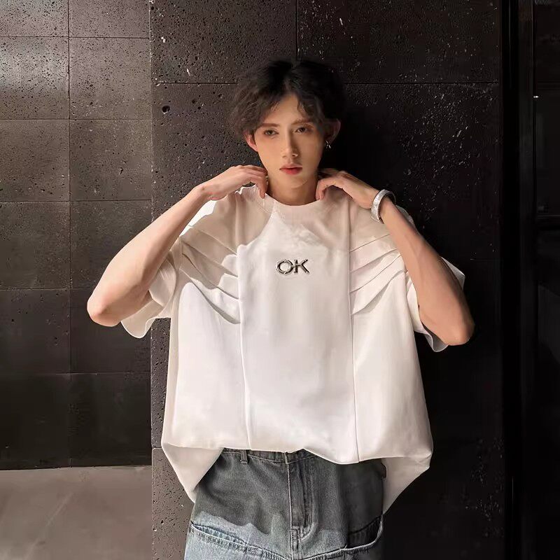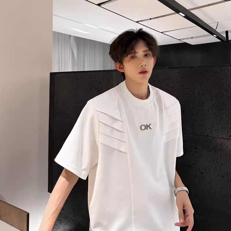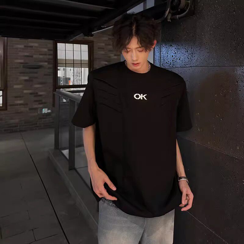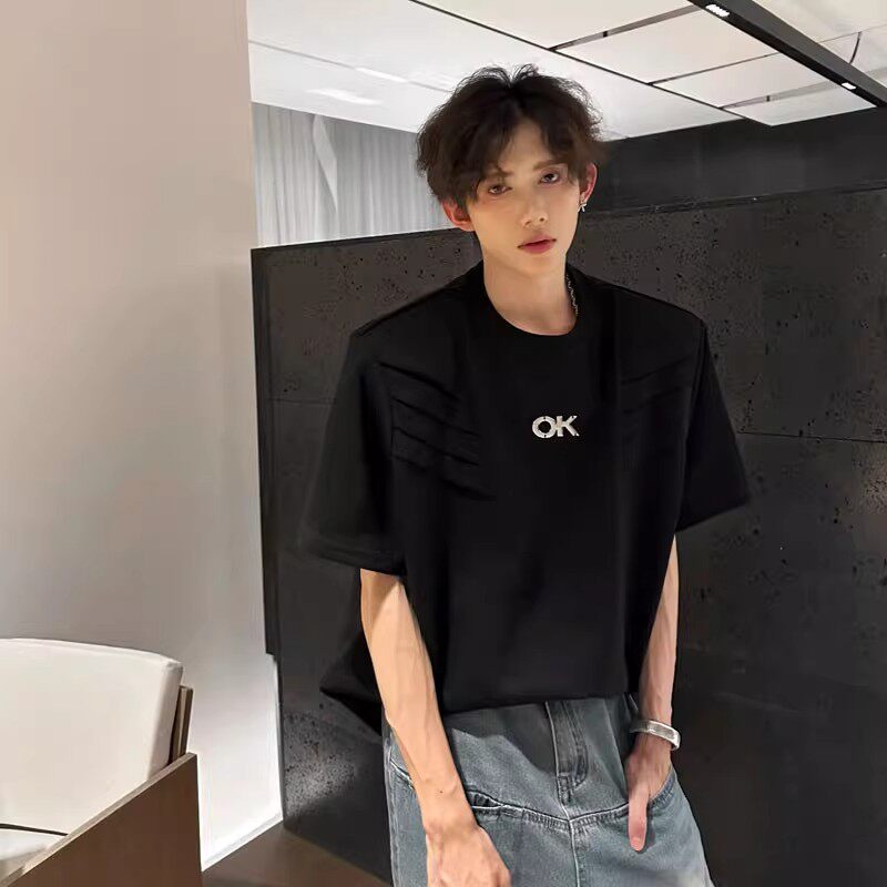 高级感设计垫肩短袖T恤男士美式高街宽松休闲5分半袖上衣白色黑色