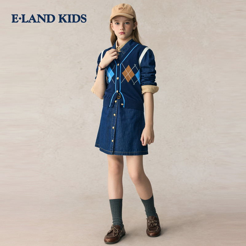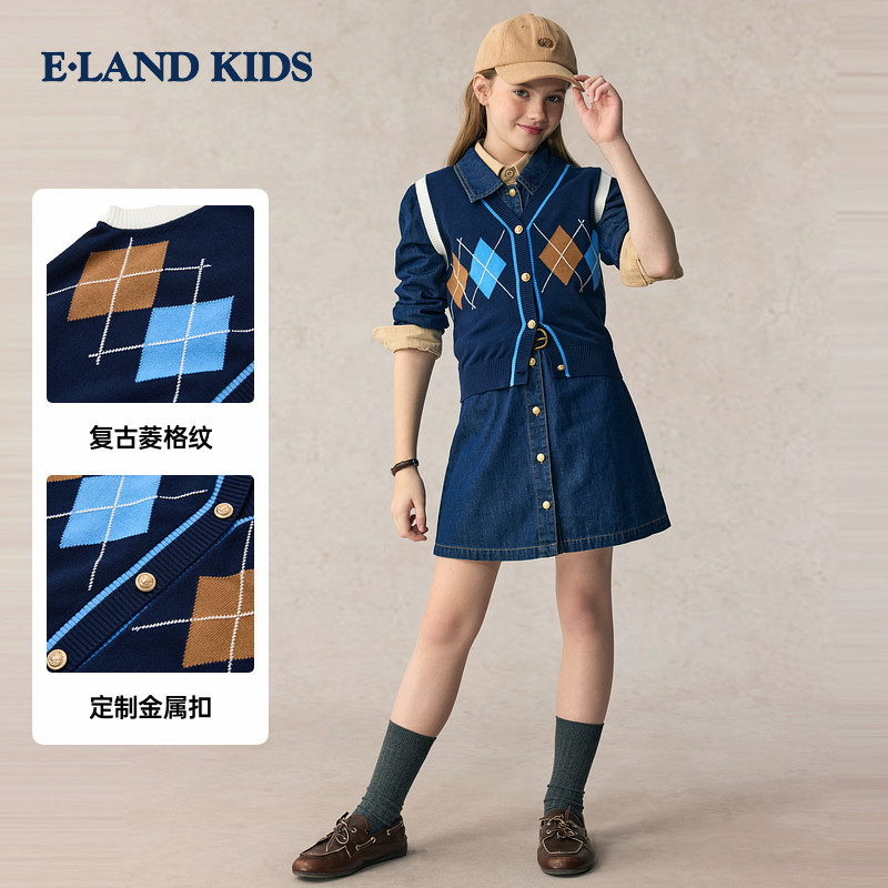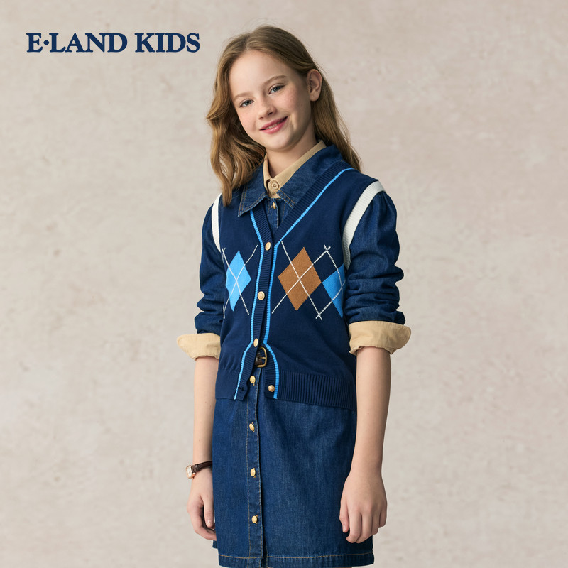 【100%棉】eland kids衣恋童装女童马甲春秋V领针织衫休闲毛衣