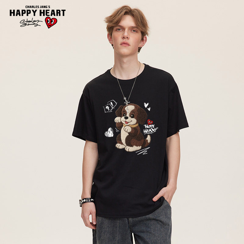 查尔斯桃心 仿刺绣小狗印花短袖T恤男夏季新款纯棉宽松圆领半截袖