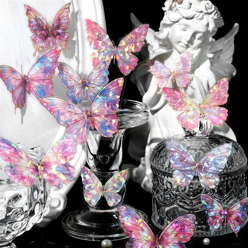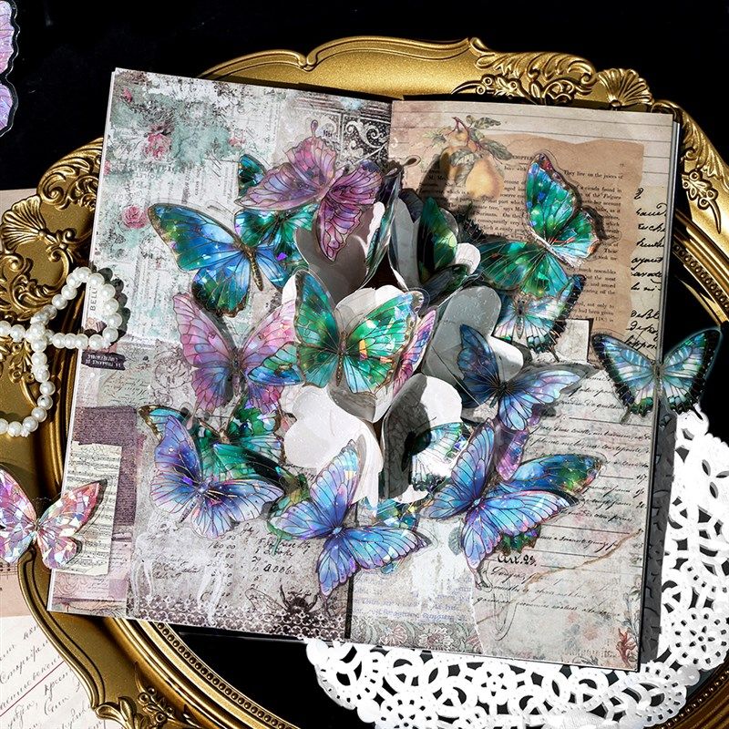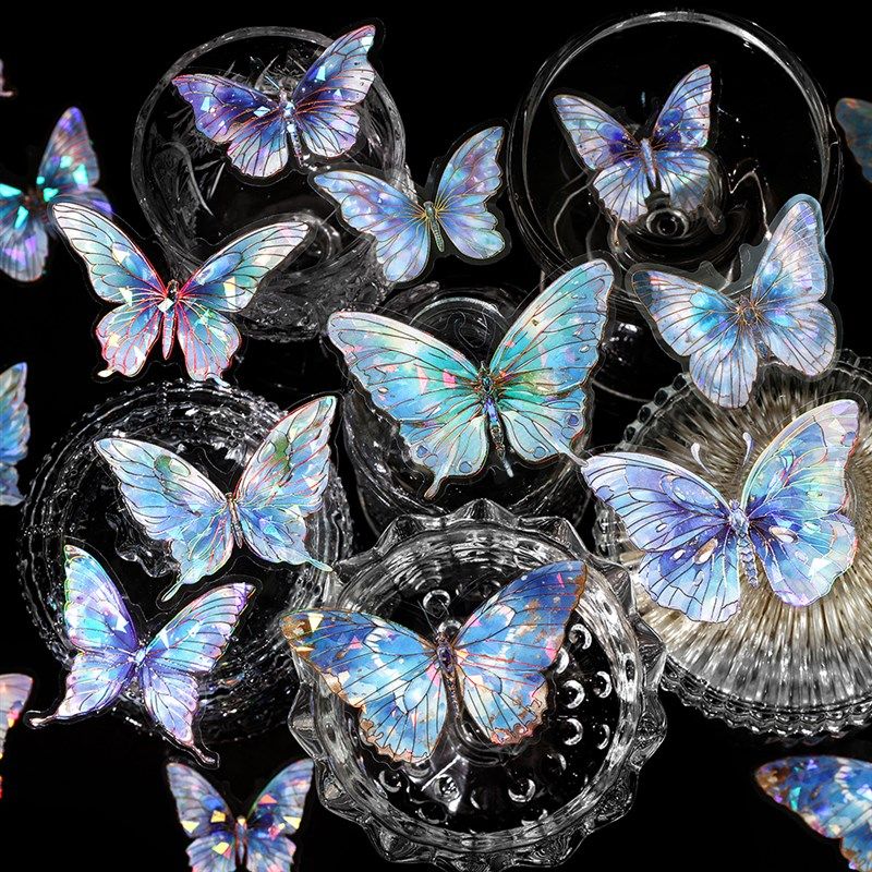 蝴蝶炫彩PET贴纸立体镭射贝壳光流麻痛包手帐拼贴DIY装饰素材贴画