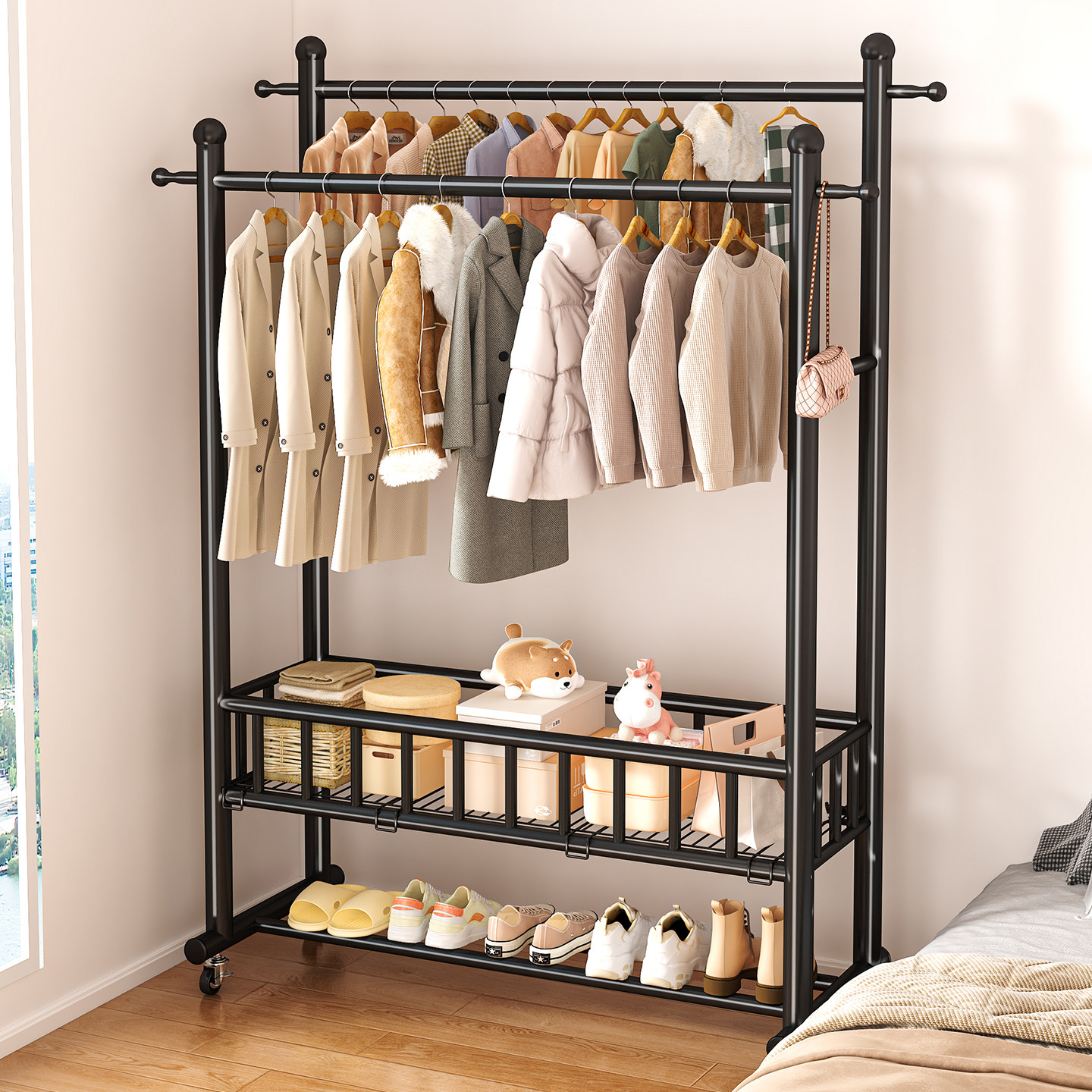 双杆挂衣架落地卧室家用可移动挂衣服架子室内晾衣架多功能衣帽架