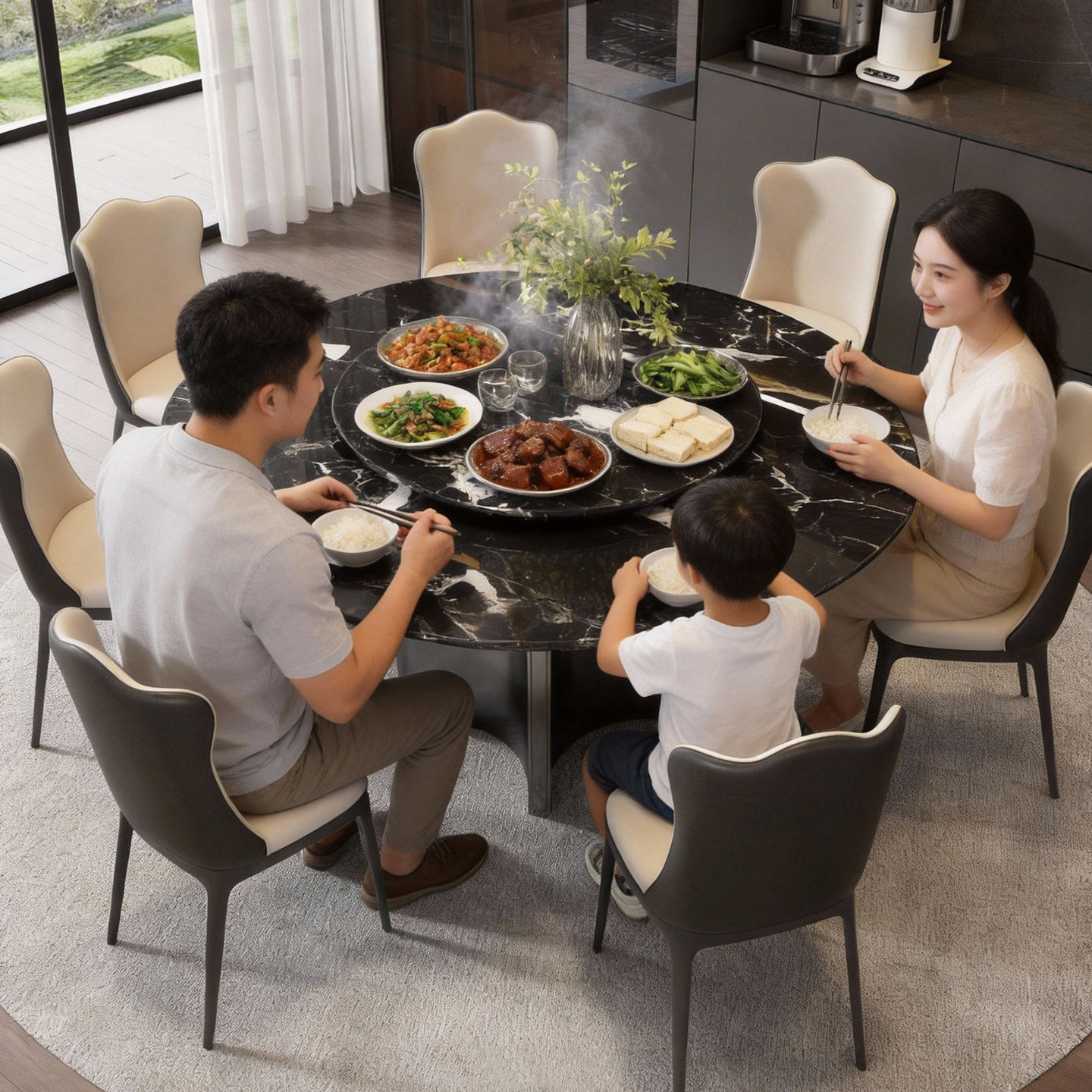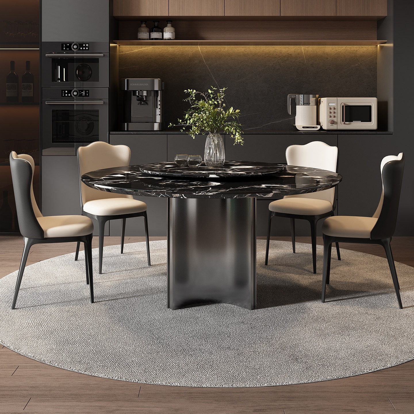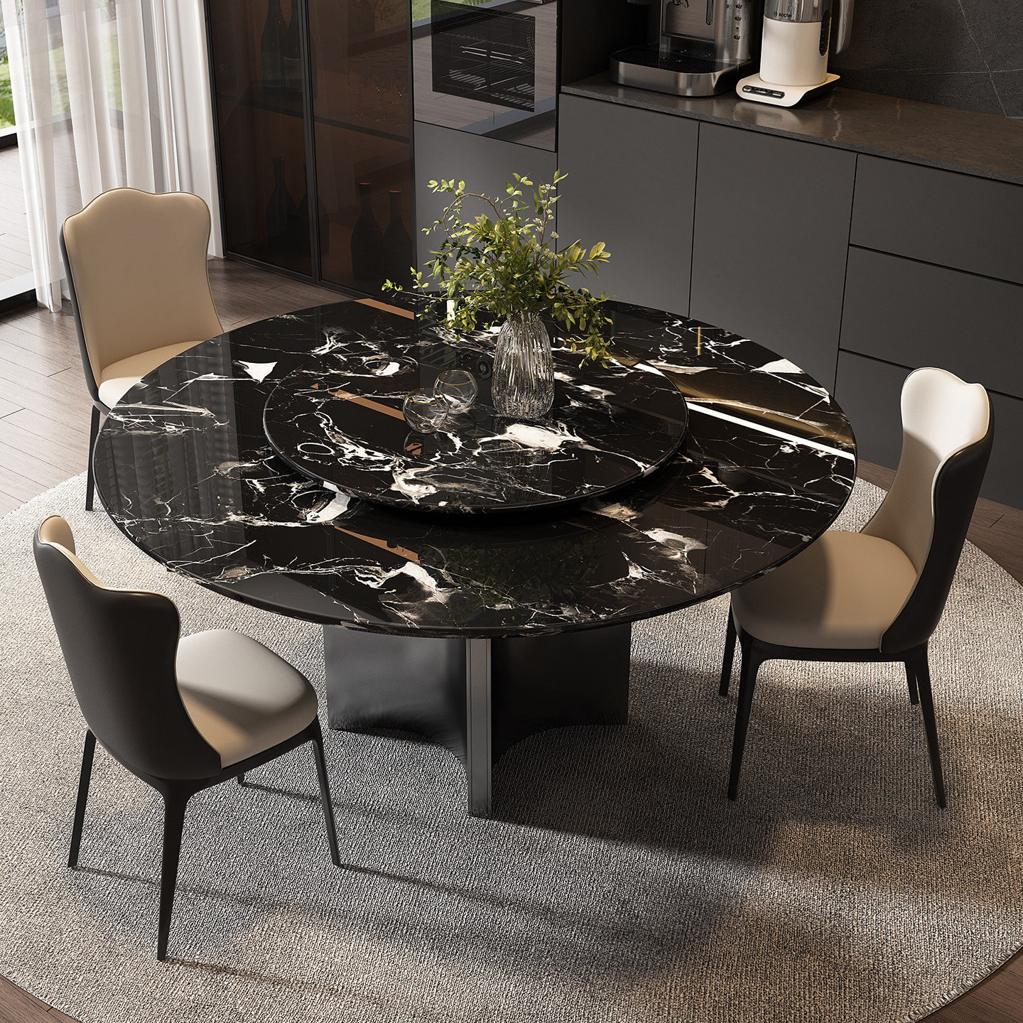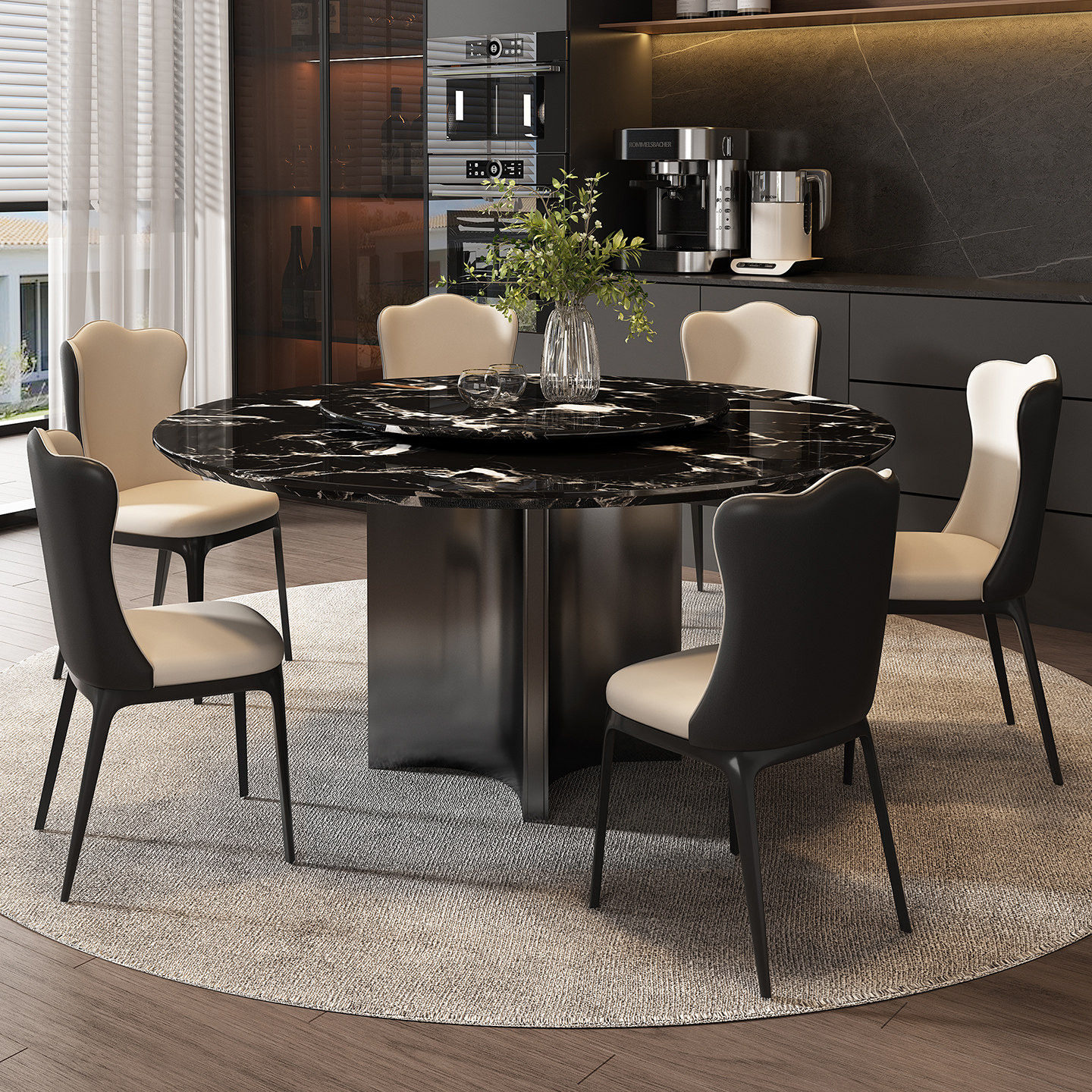 进口黑玫瑰奢石餐桌天然大理石圆桌意式轻奢高级感家用圆形餐桌椅