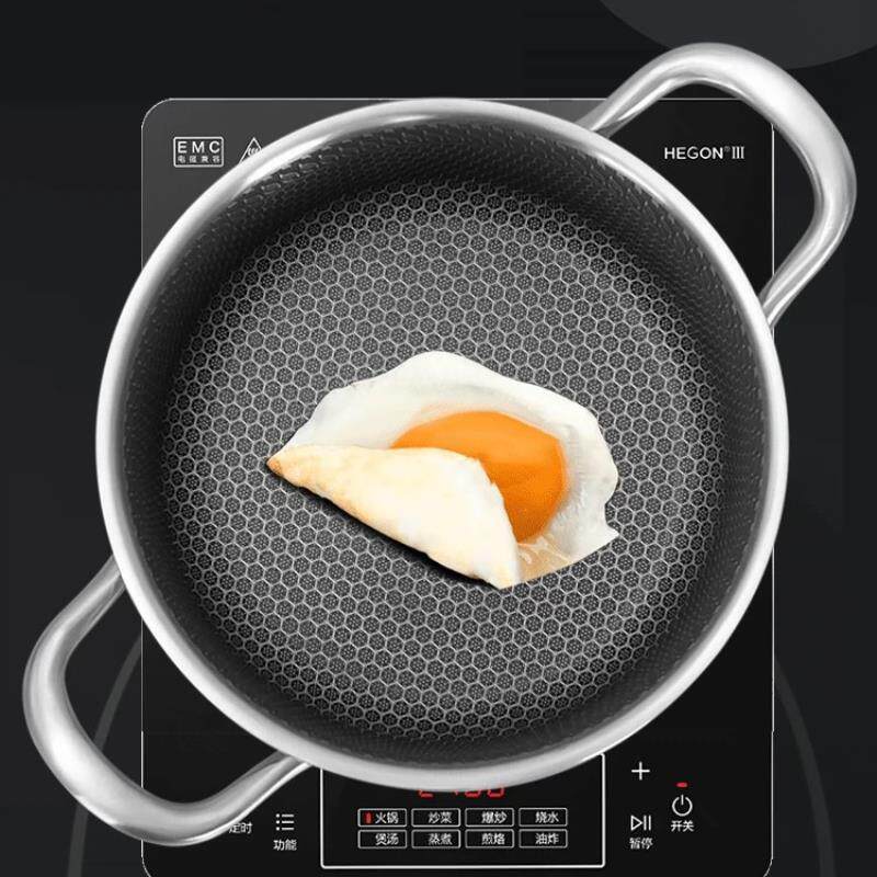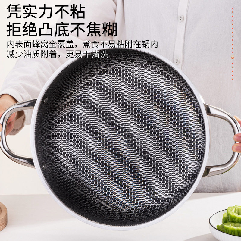 不锈钢双耳煎锅蜂窝不粘海鲜干锅家用煎锅电磁炉燃气炉通用