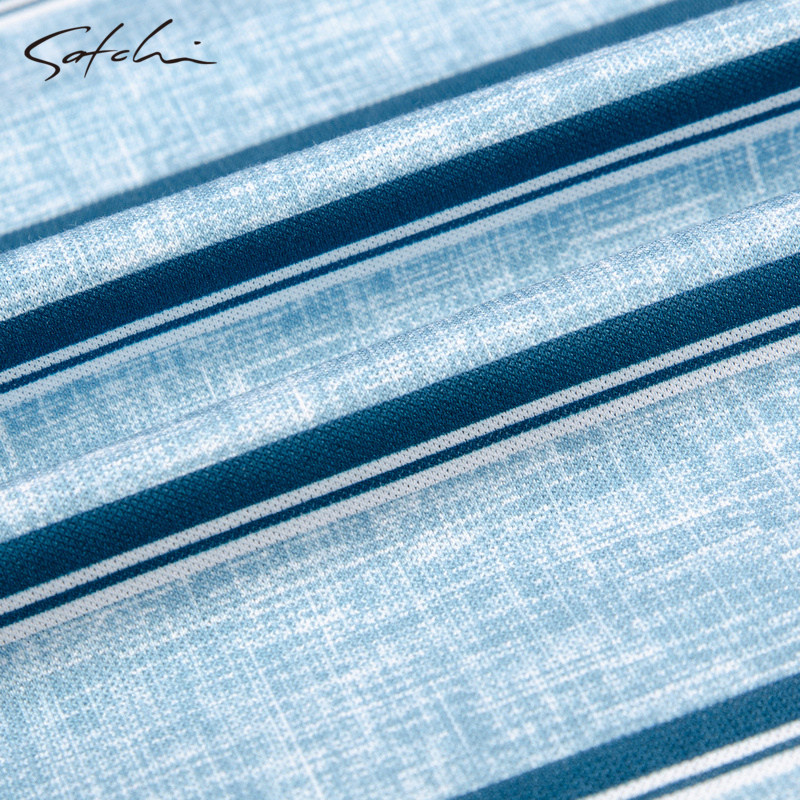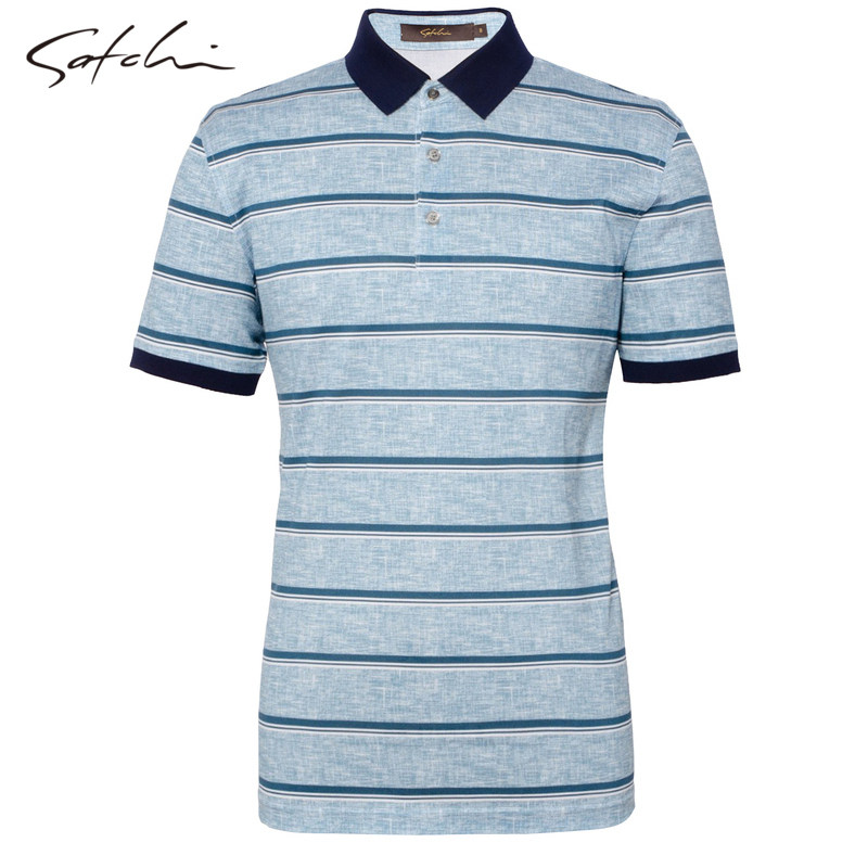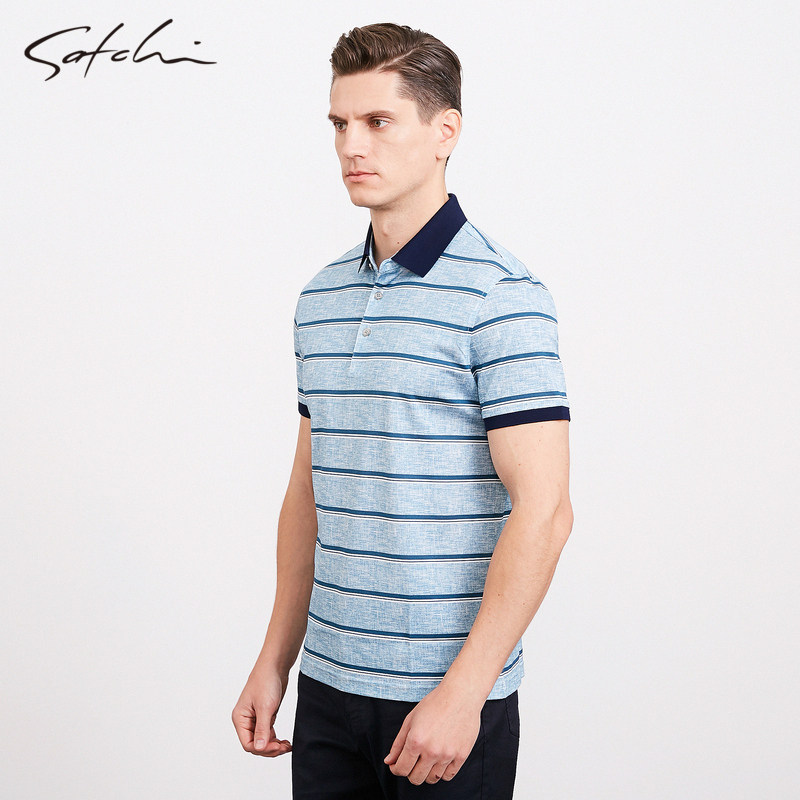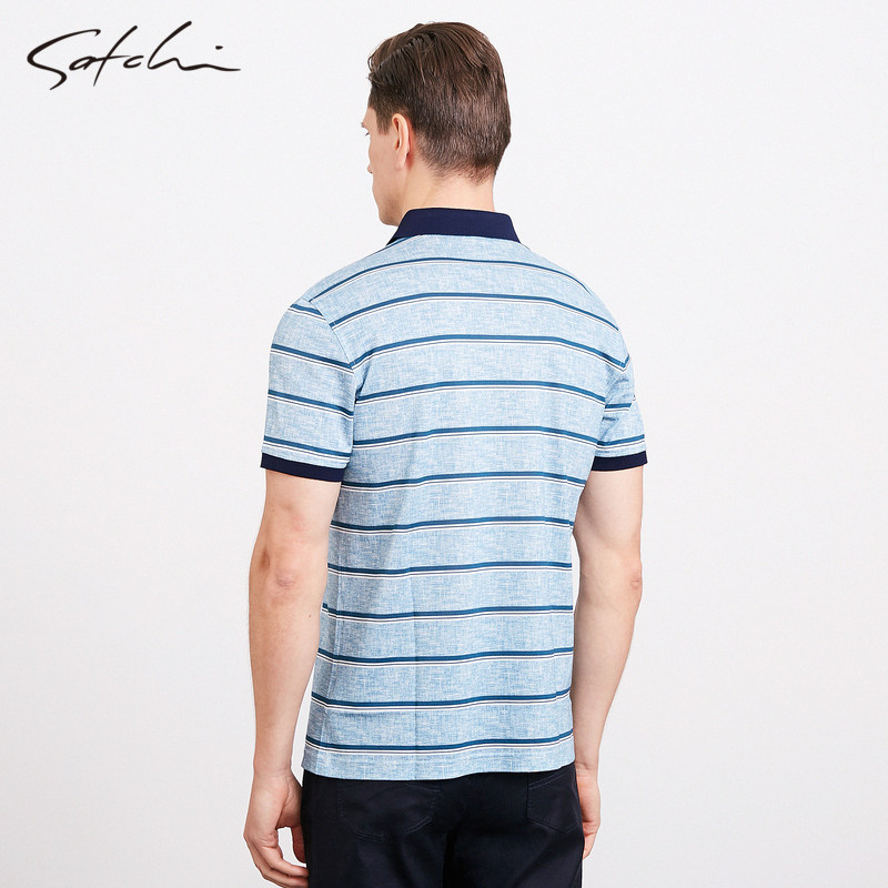 Satchi沙驰男装春季新款休闲条纹桑蚕丝棉短袖T恤舒适POLO衫男