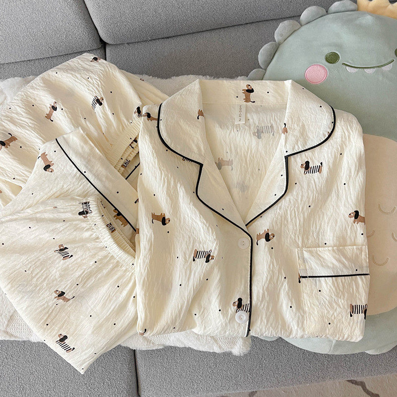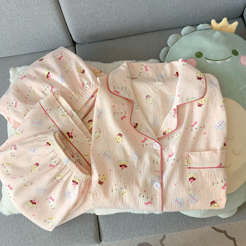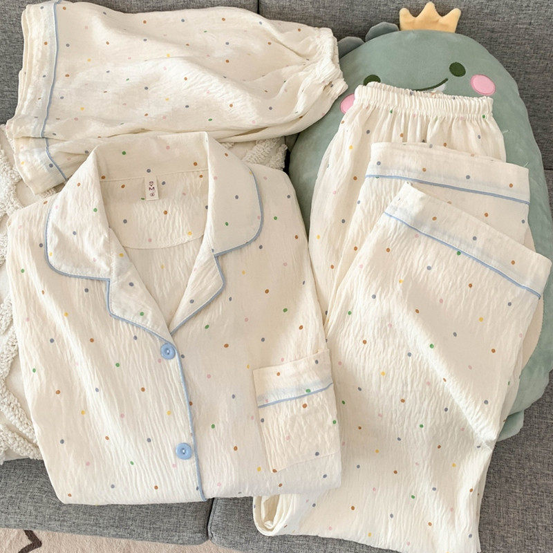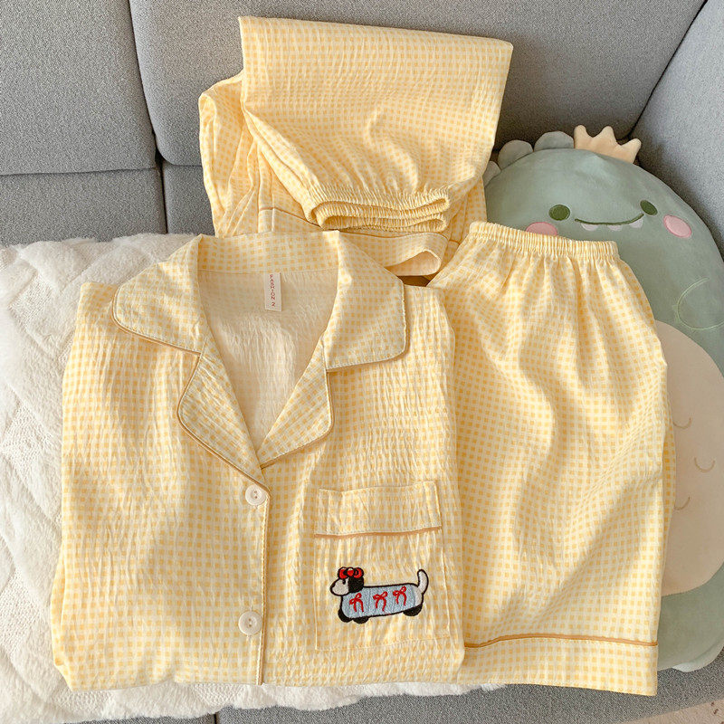 红豆云朵纯棉纱睡衣女夏季薄款短袖日系ins可爱蓝色小熊三件套家