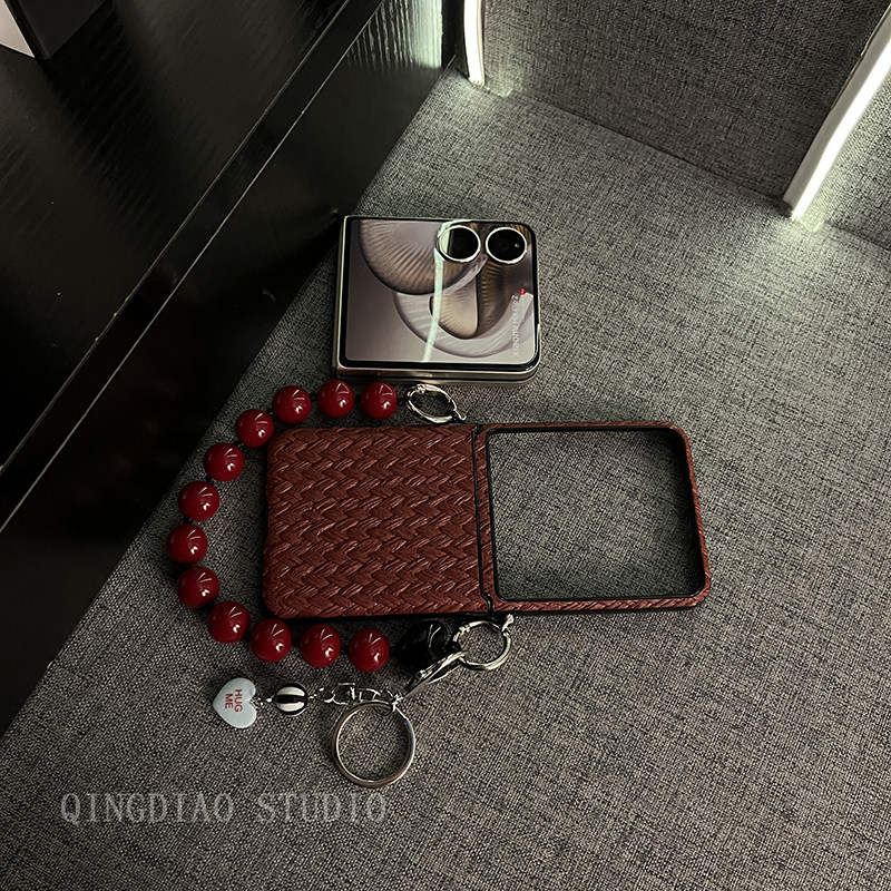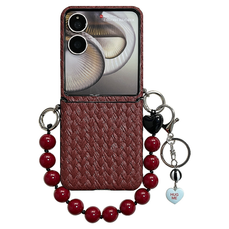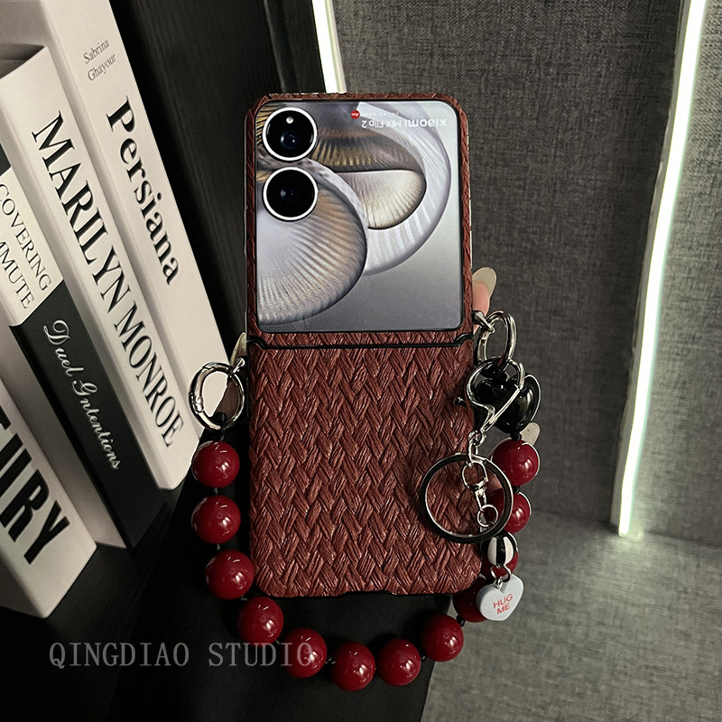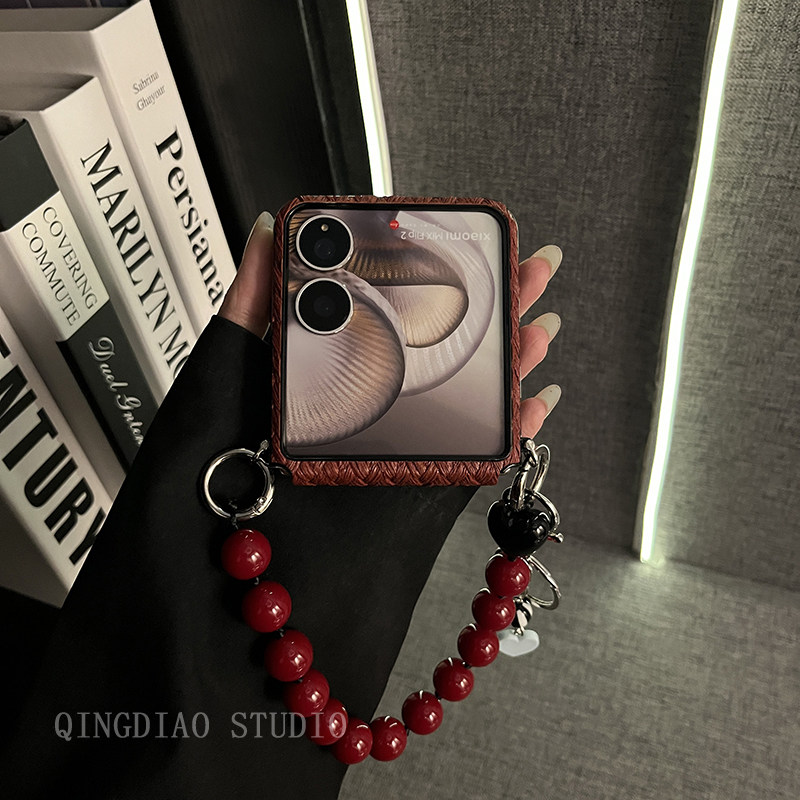 轻调 温柔ins暗红色草席纹串珠手提链适用于小米MIX Flip2手机壳全包新款MIX限量版flip折叠屏翻盖防摔保护套