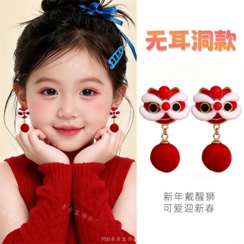 儿童耳夹无耳洞醒狮新年过年耳环钉坠红色秋冬小众免打孔气质耳饰