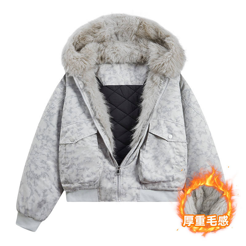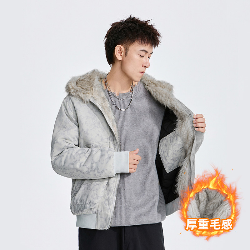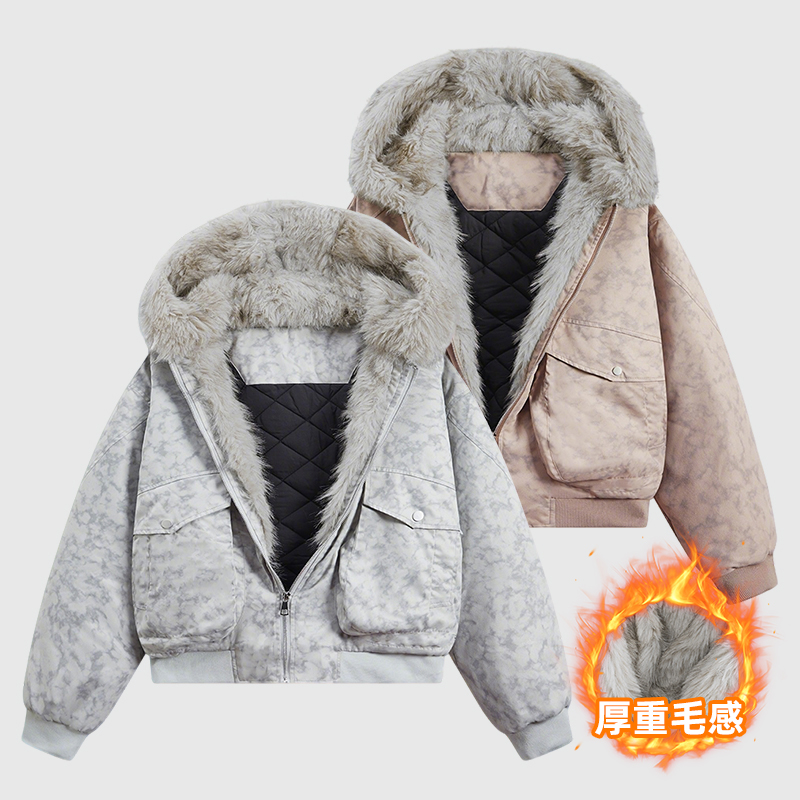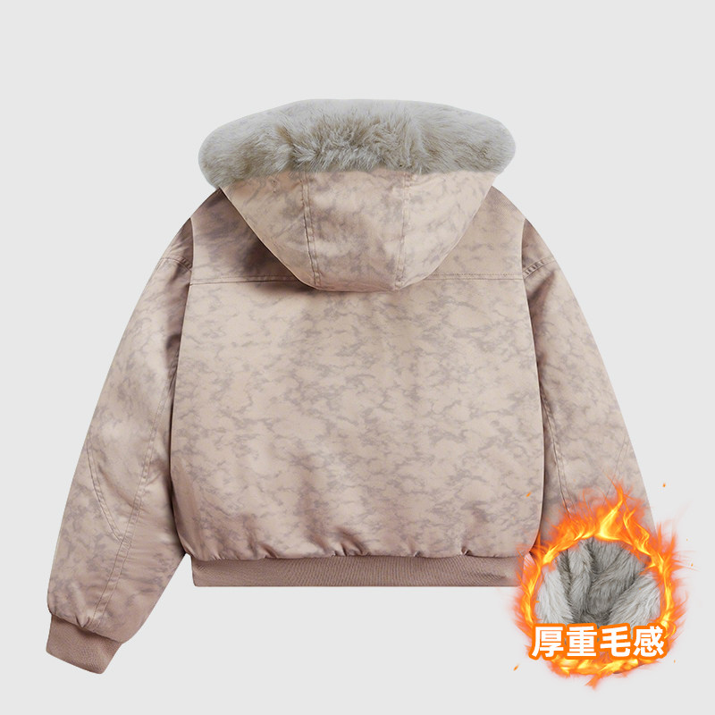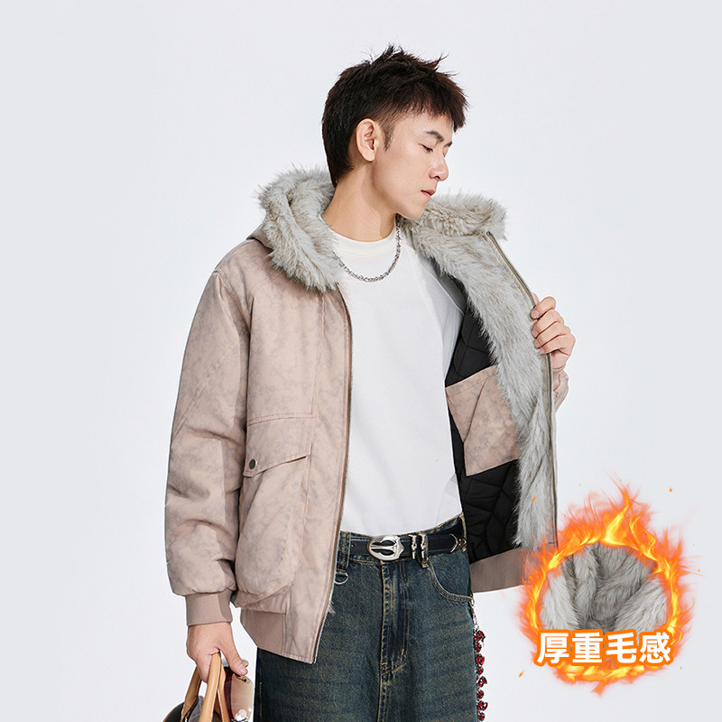 水曜日定休纹理帆布座山雕连帽棉服加绒加厚水洗男女同款夹克外套