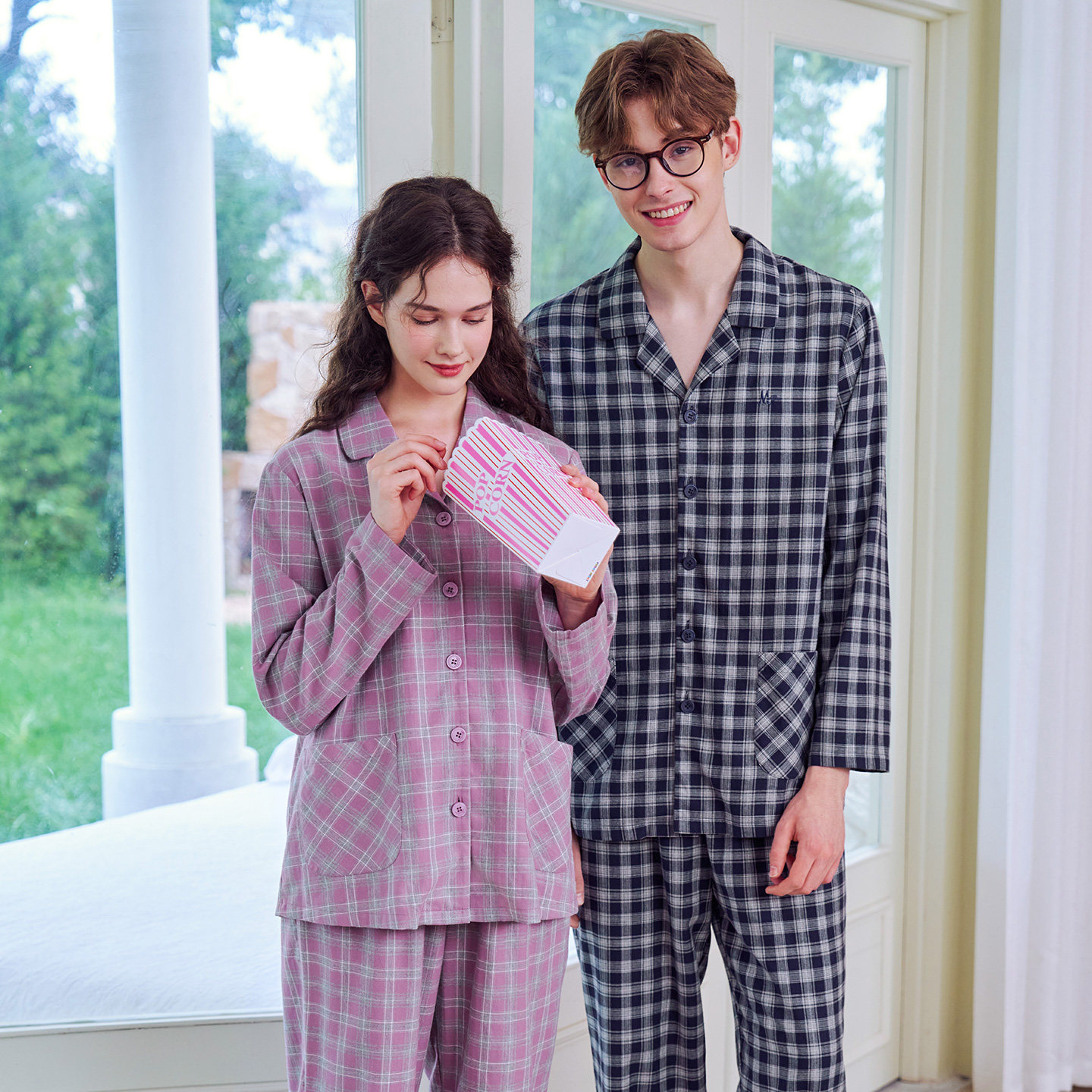 美标新款春秋季长袖情侣纯棉睡衣套装女男士全棉休闲格子家居服冬