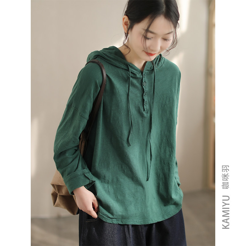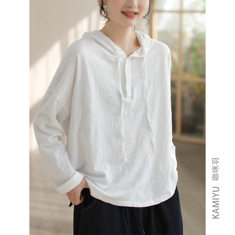 咖咪羽打底衫女春装新款女式全棉宽松纯色连帽气质休闲复古上衣