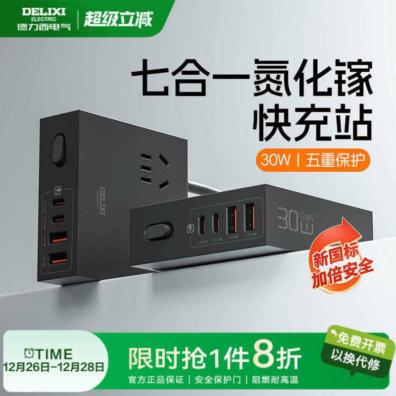 德力西插座插排排插充电氮化镓转换器快充多功能桌面插线板大功率