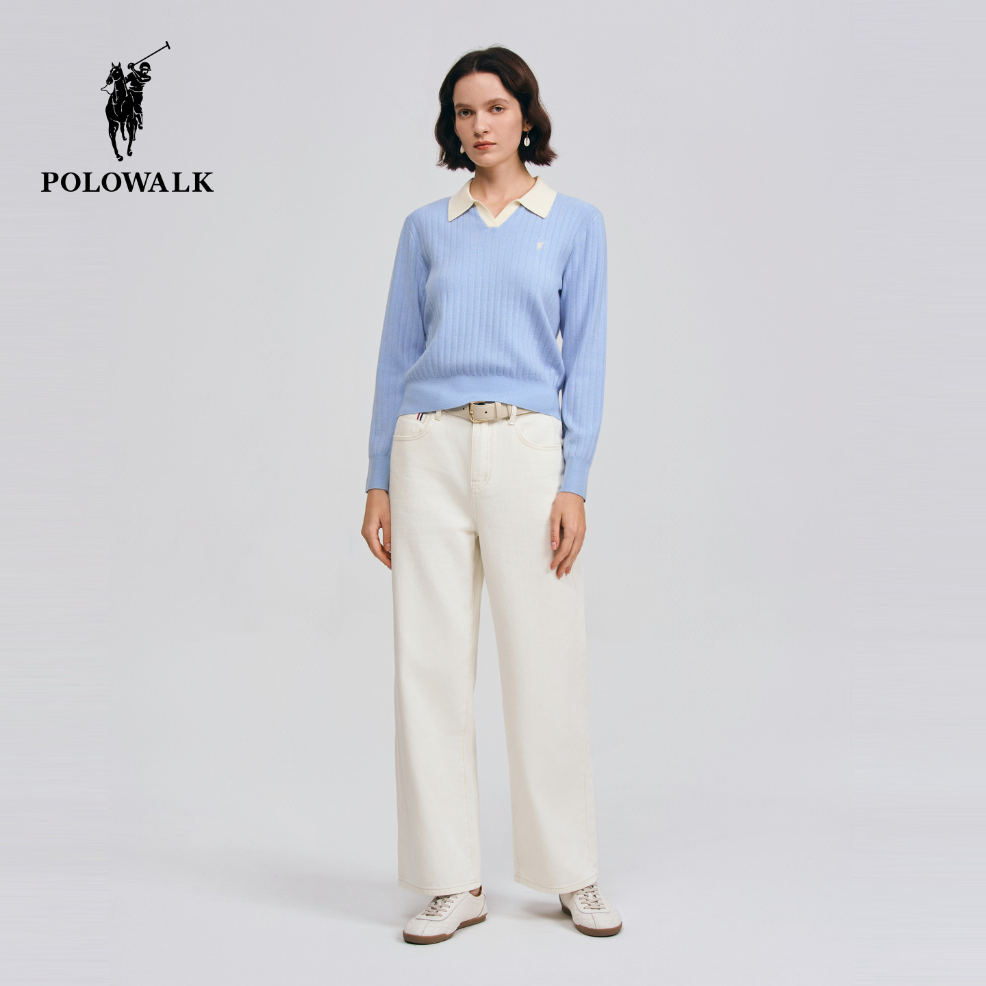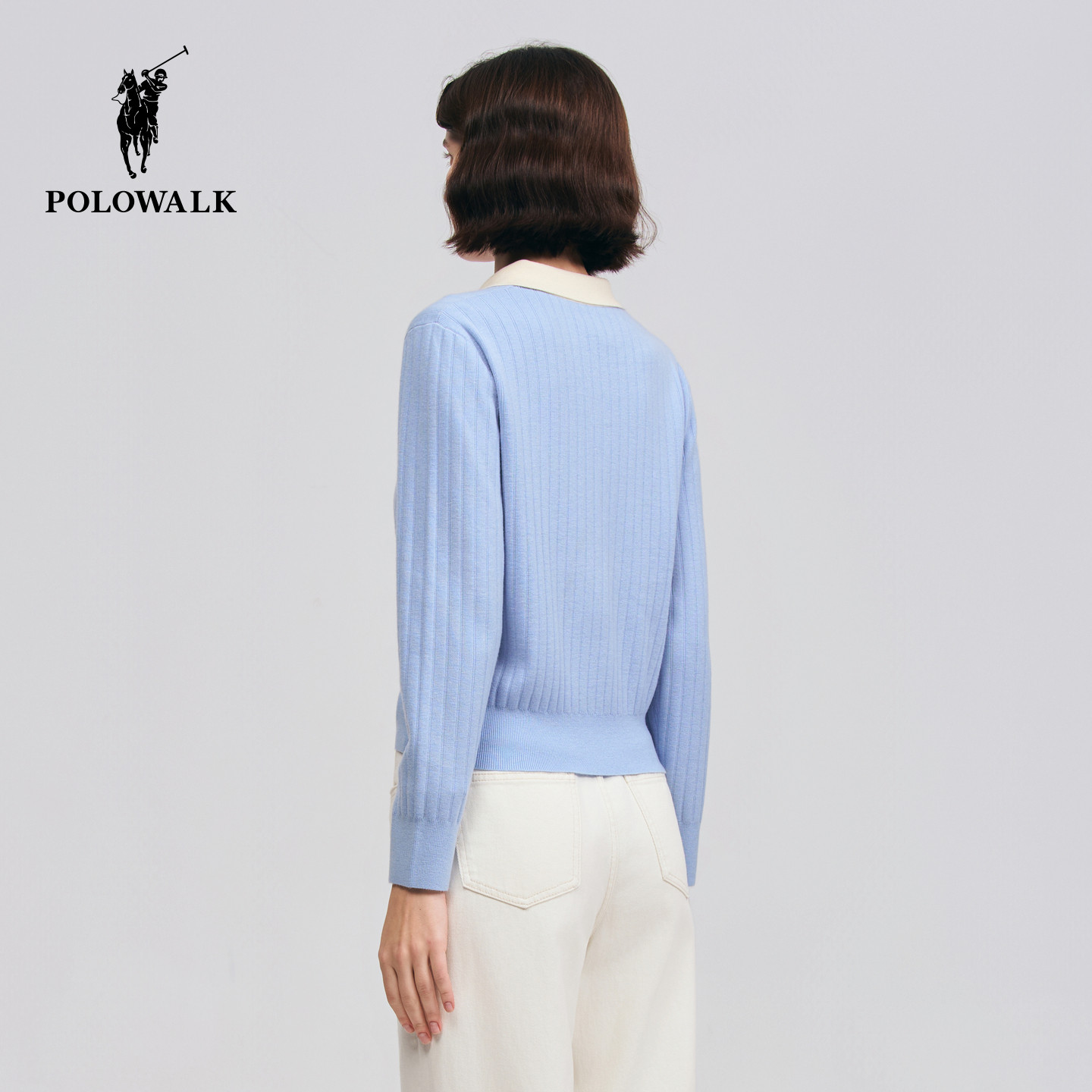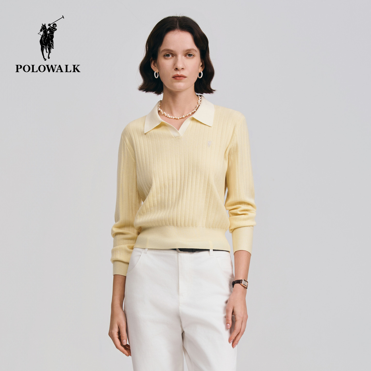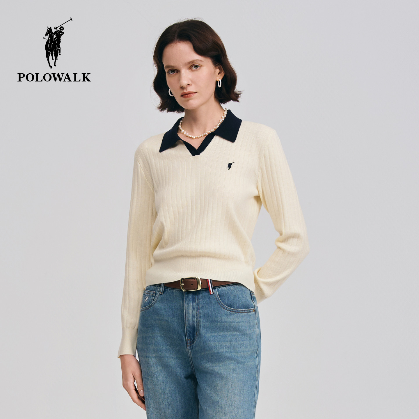 POLOWALK女式长袖针织衫2026春季新品休闲套头翻领显瘦针织上衣女