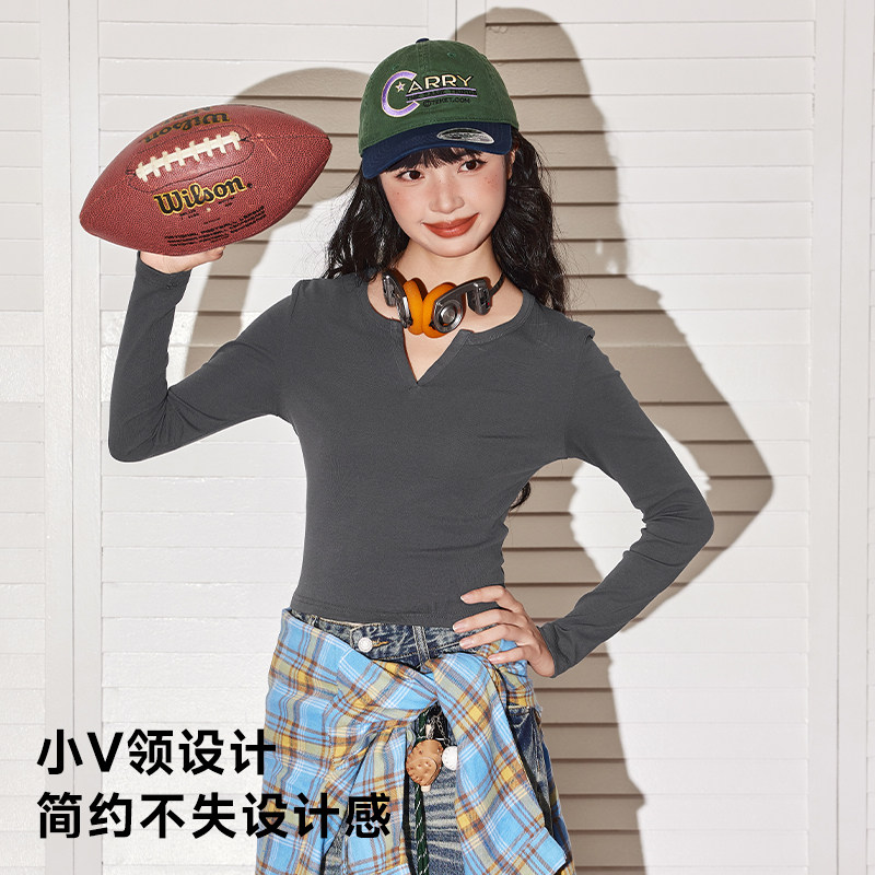 唐狮官方修身长袖t恤女2026新款春季小v领显瘦打底衫黑色短上衣VC