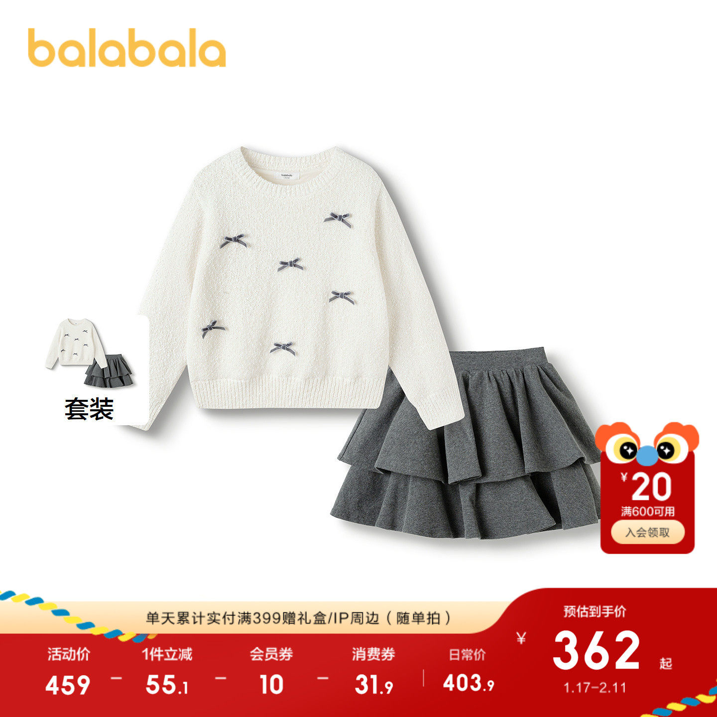 【商场同款】巴拉巴拉儿童短裙套装女童2件套新款童装2025冬甜美