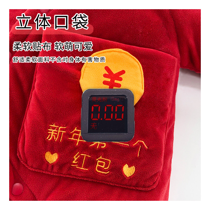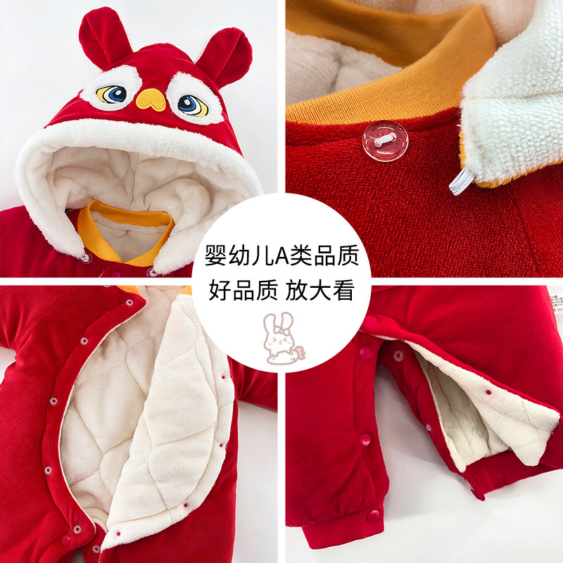 婧麒婴儿拜冬年服保暖夹棉连帽连体衣满月宝宝红色喜庆加厚外出服