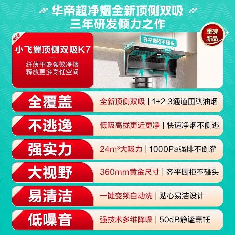 小飞翼K7/K3华帝顶侧双吸油烟机7字型大吸力自动清洗欧式抽烟机