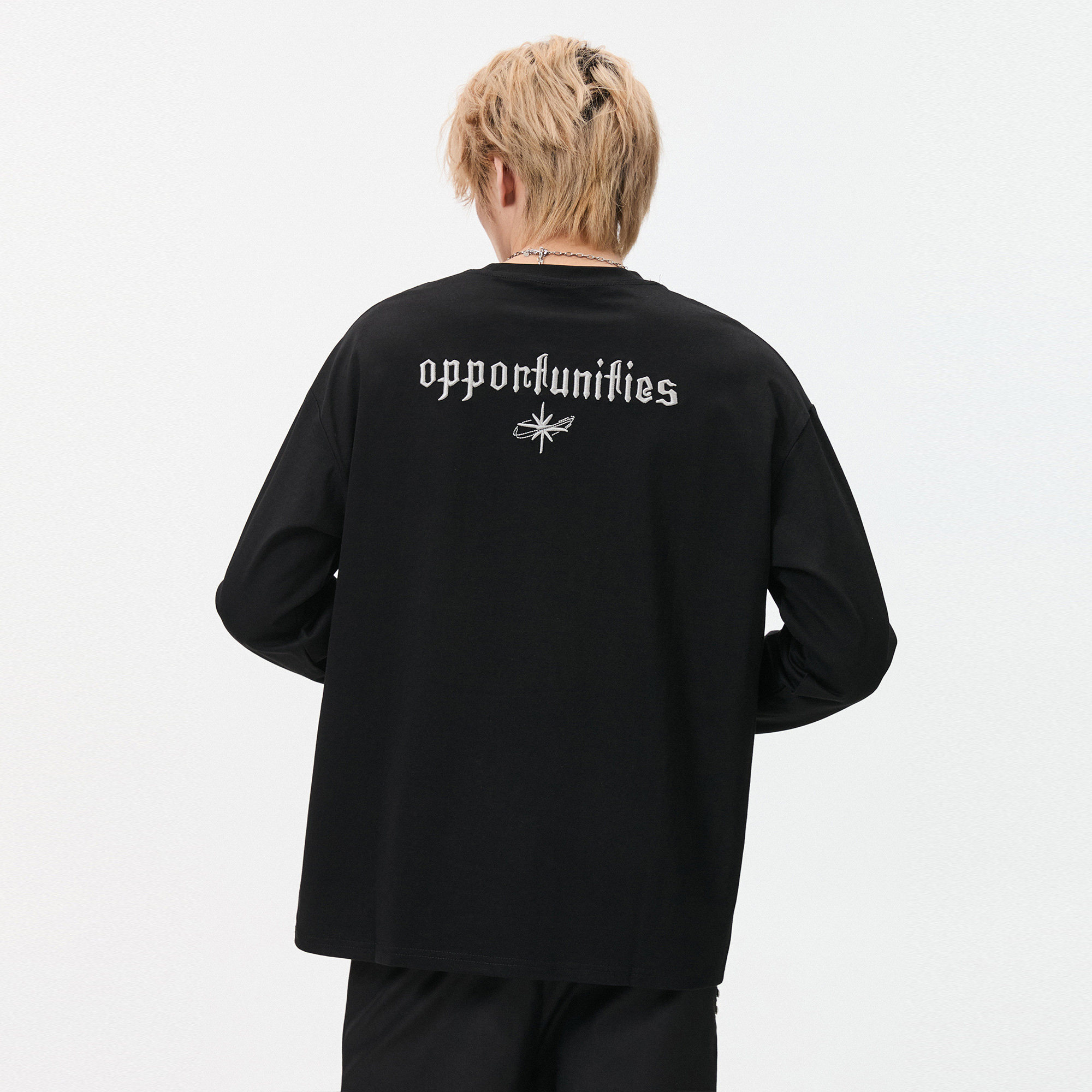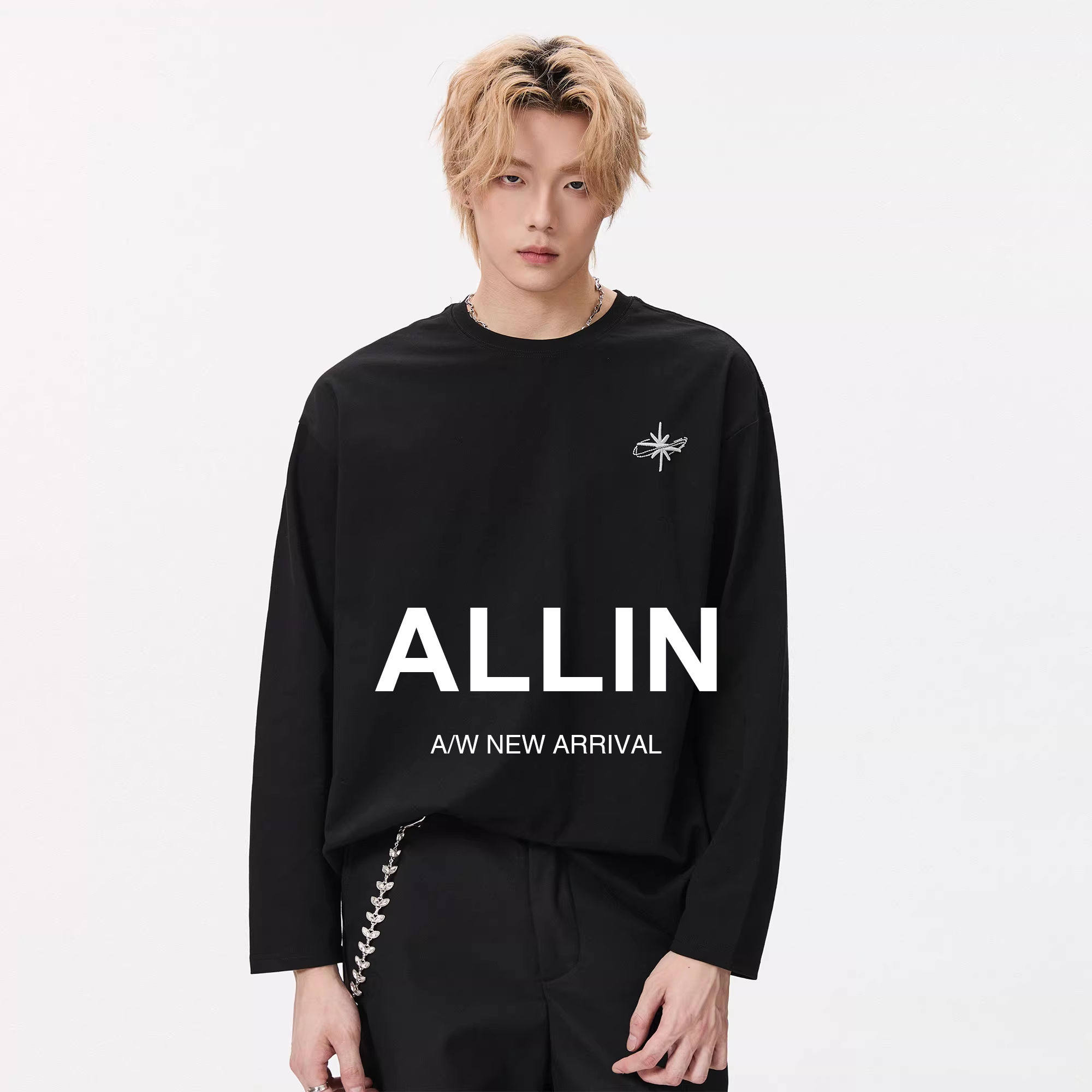 ALLIN 黑色刺绣长袖T恤男秋冬季情侣重磅圆领套头内搭打底衫上衣