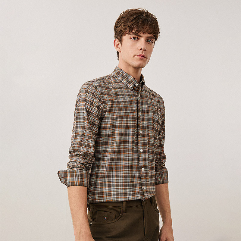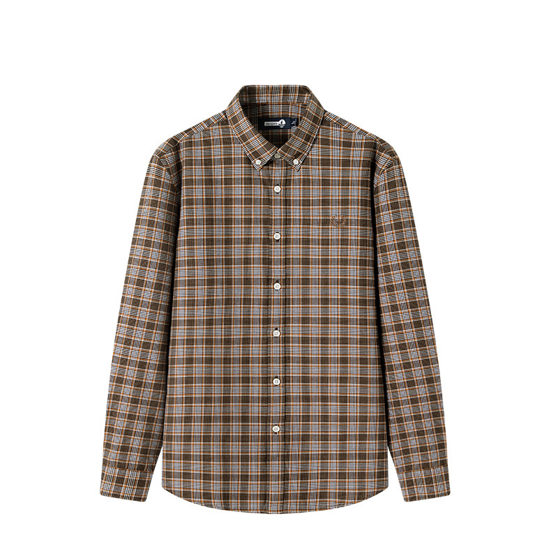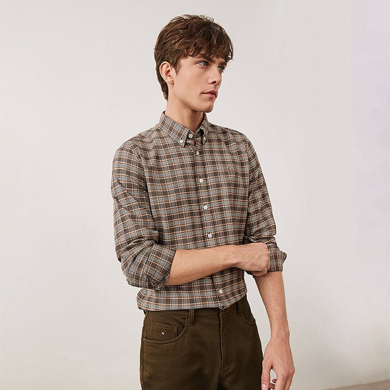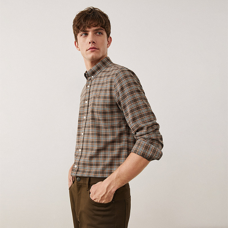 啄木鸟秋季新款男士长袖100%全纯棉磨毛格子衬衫 高级感休闲衬衣
