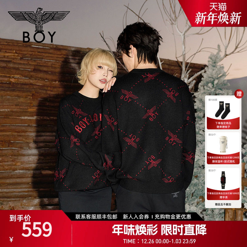 BOYLONDON春季提花潮牌毛衣黑色男女款圆领套头毛衫针织衫N60908